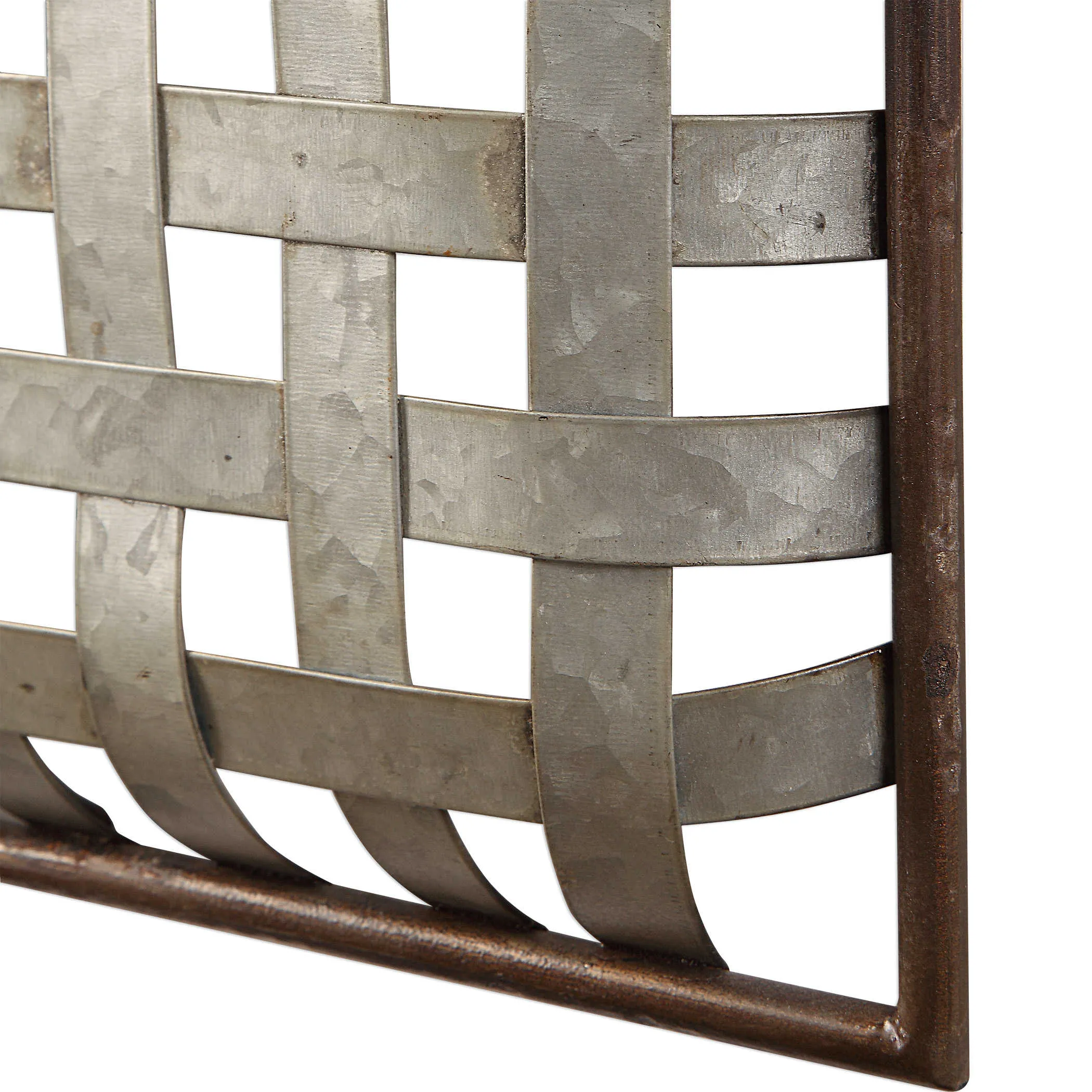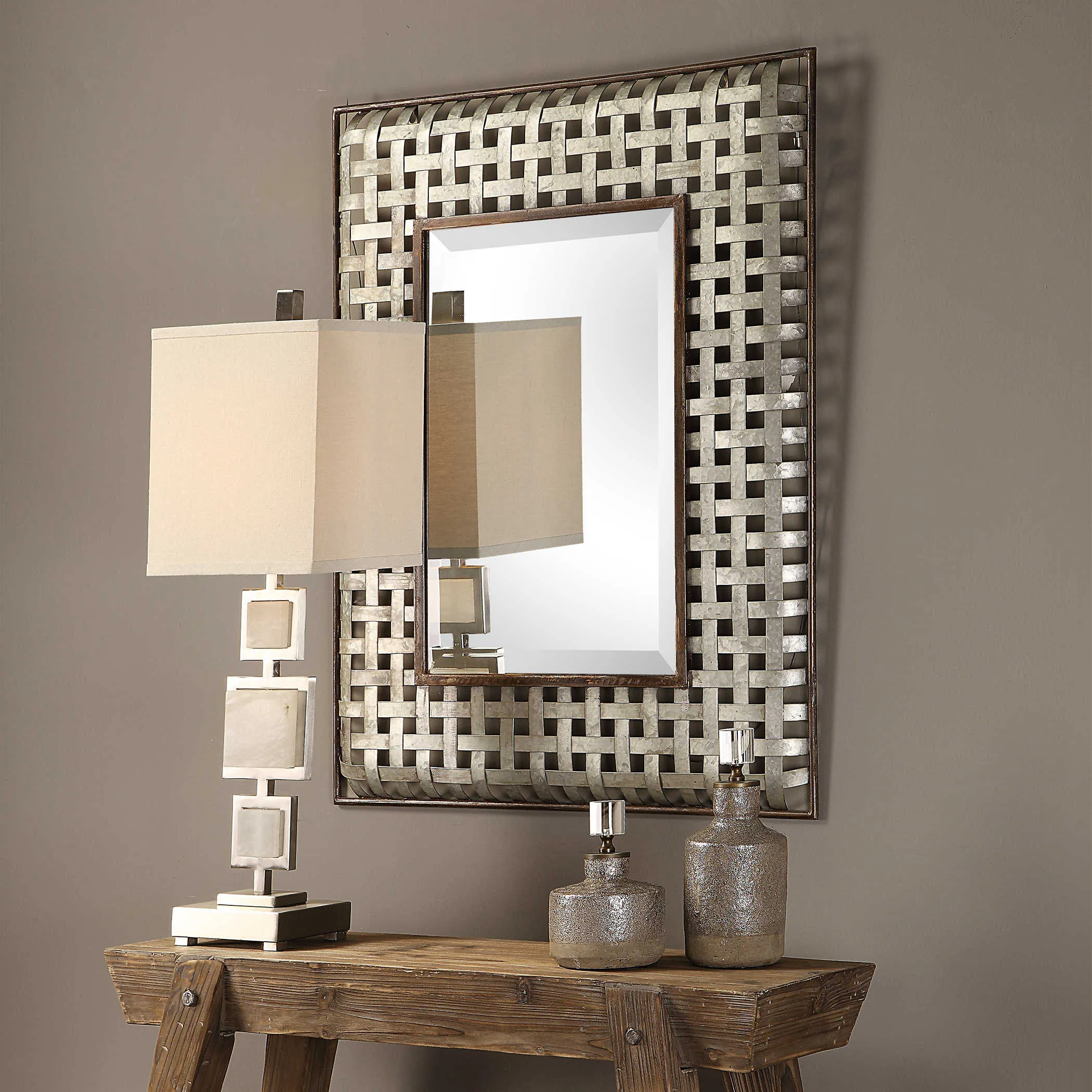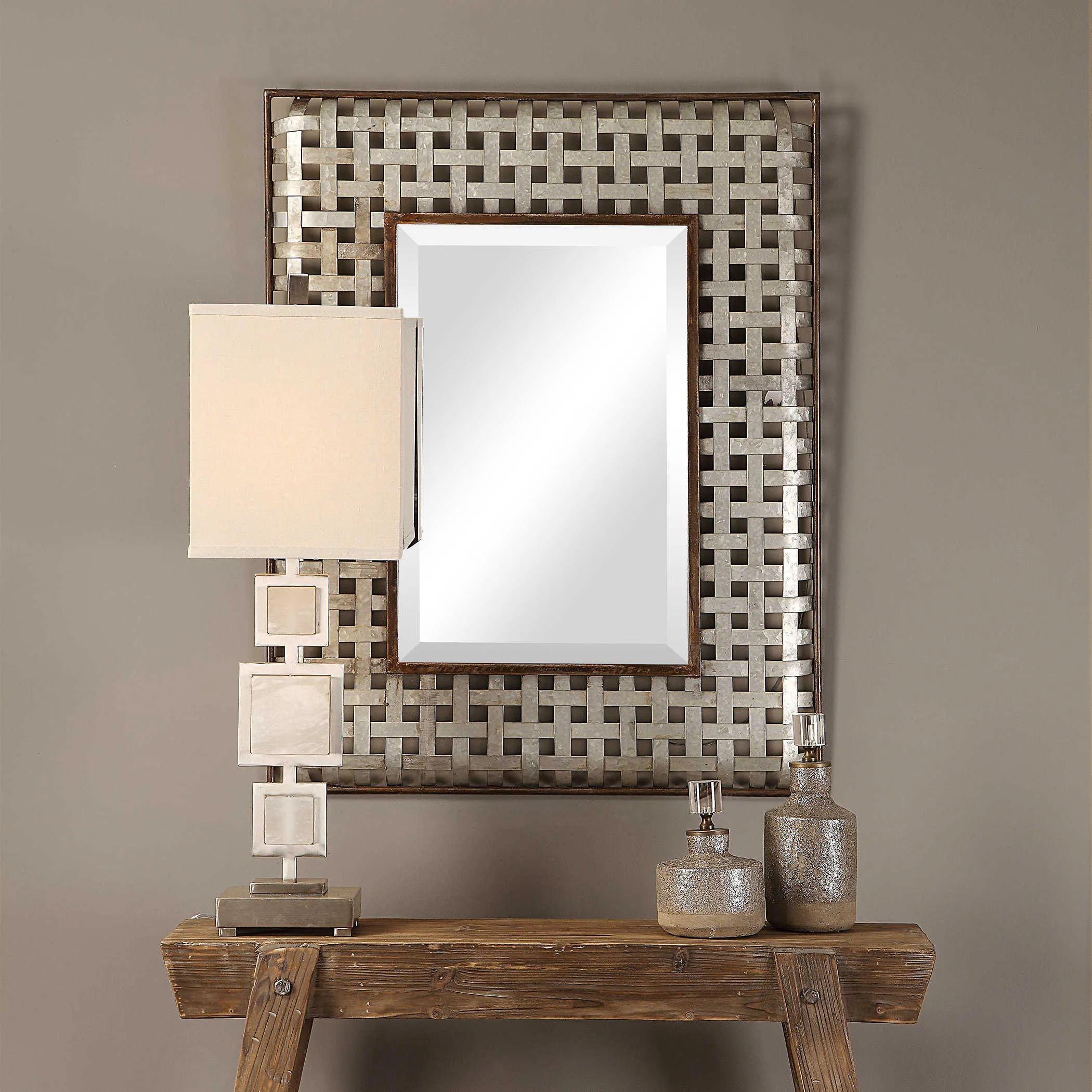 Bands of galvanized metal are woven to create a modern farmhouse look, accented with rustic dark bronze inner and outer ledges. Mirror features a generous 1 1/4" bevel. May be hung horizontal or vertical.