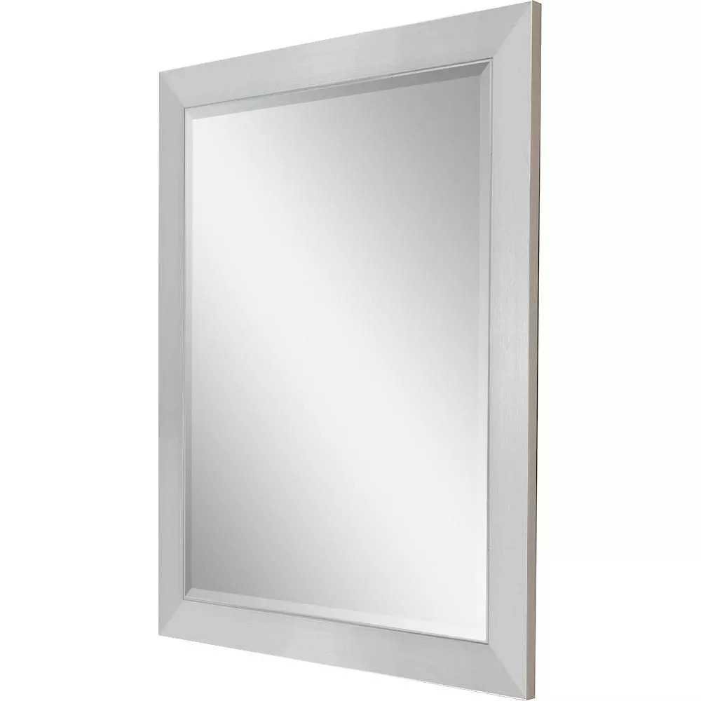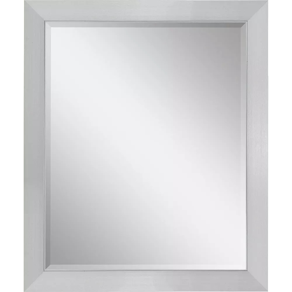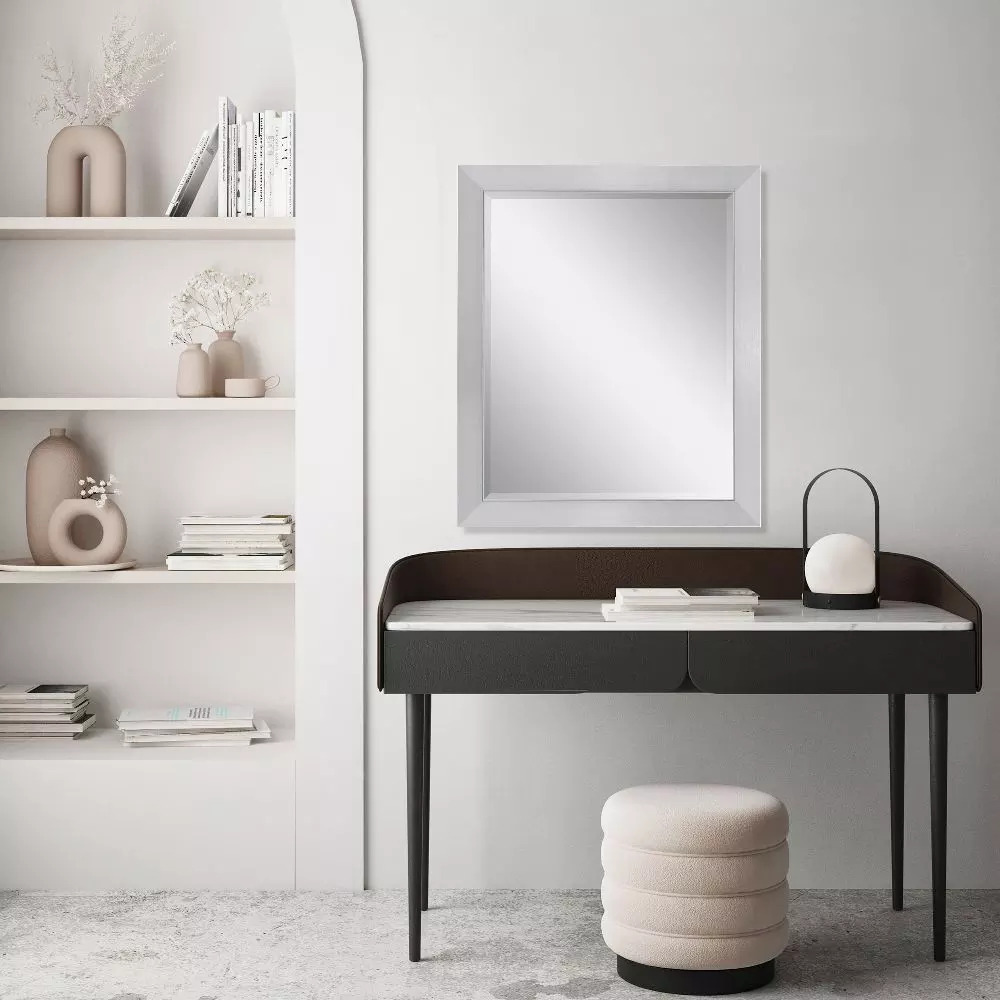 Elegant beveled mirror is framed in a contemporary style moulding in a chrome-silver finish.