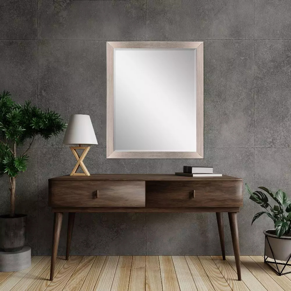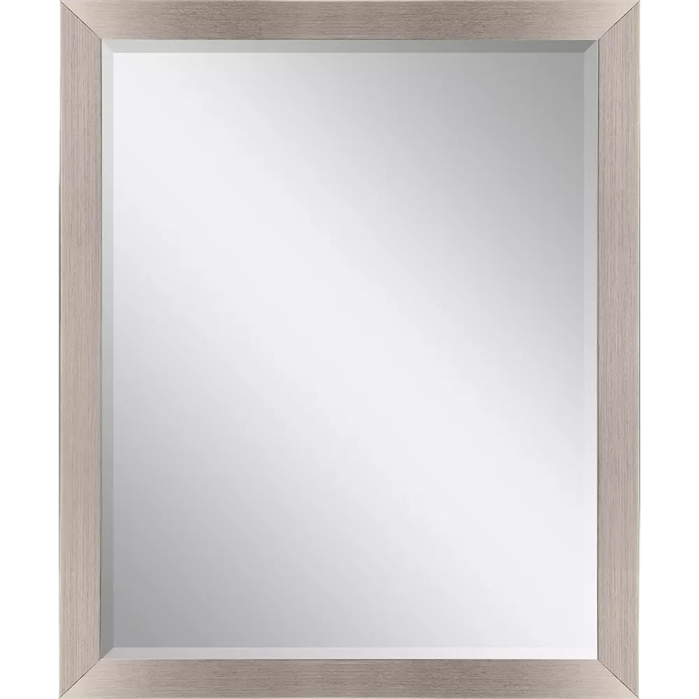 Elegant beveled mirror is framed in a sleek contemporary moulding in a brushed silver finish with black lip.