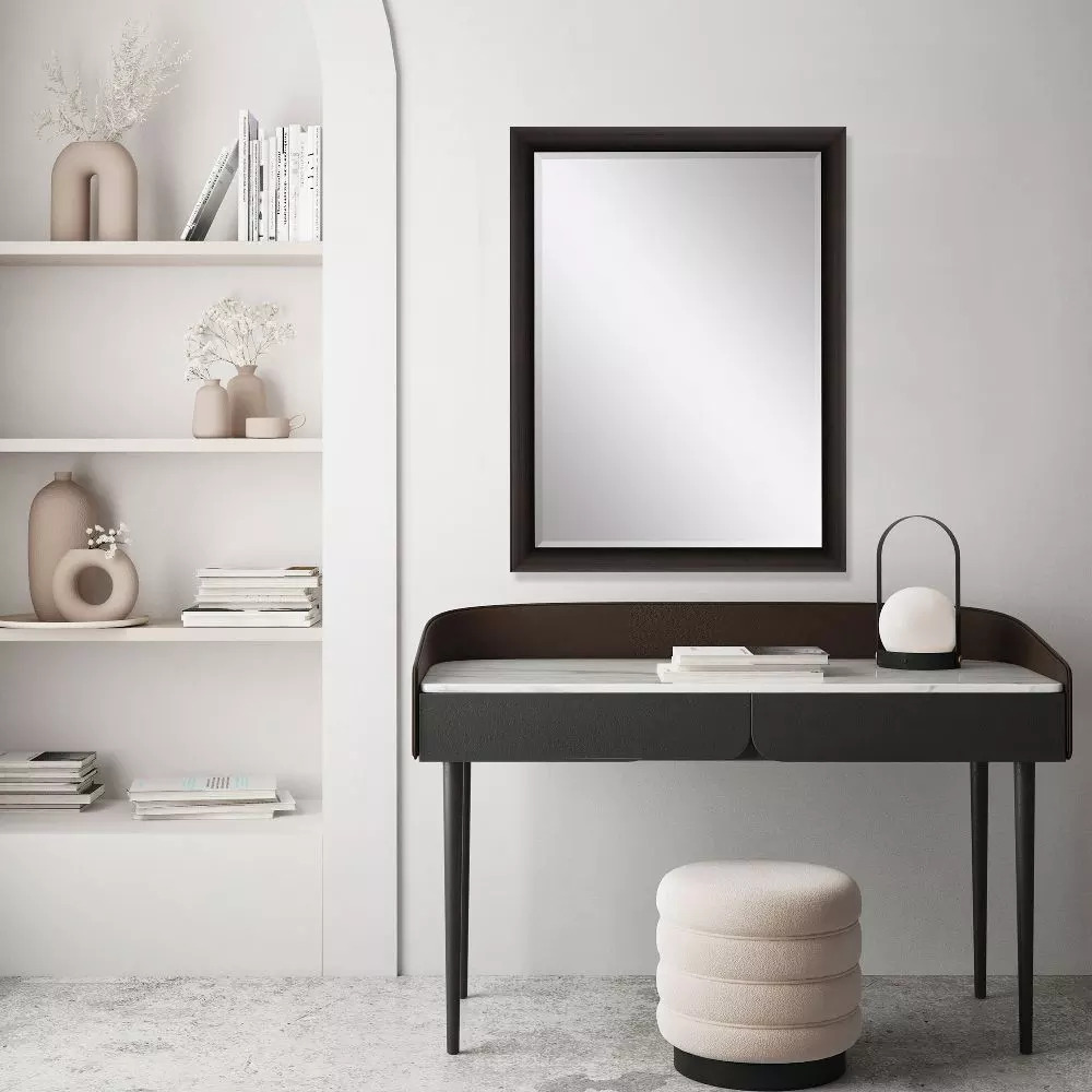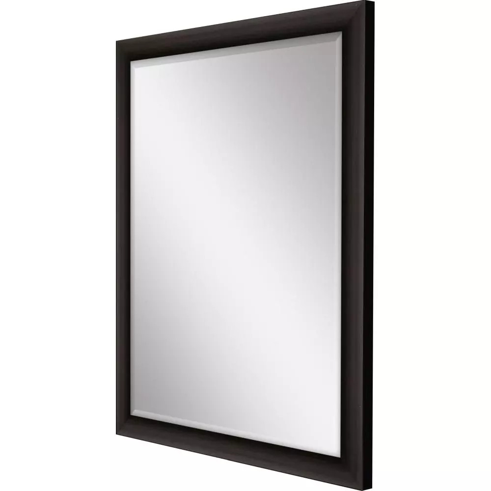 Elegant beveled mirror is framed in a block profile moulding in a dark wood finish with silver lip.
