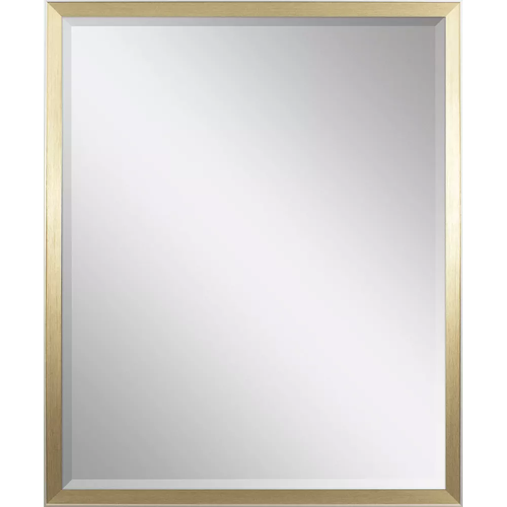 Elegant beveled mirror is framed in a modern gold finish moulding with a champagne gold side and lip.