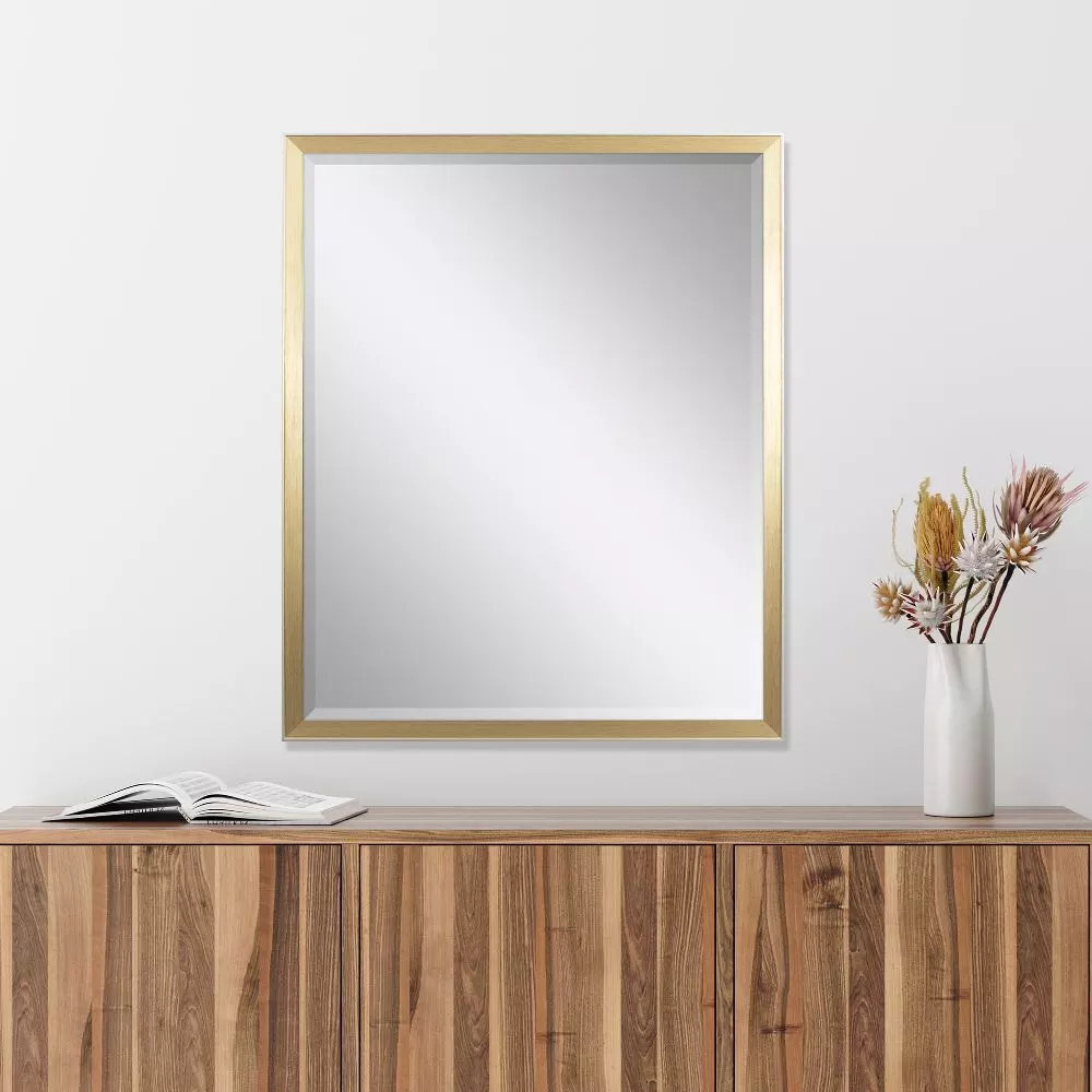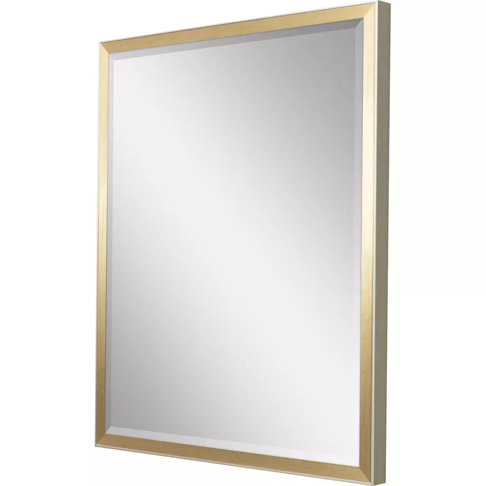 Elegant beveled mirror is framed in a modern gold finish moulding with a champagne gold side and lip.