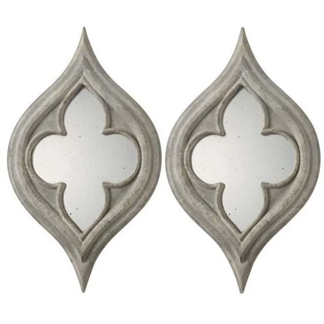 Provides an elegant charm and finishing touch to any room. Frames have a distressed, stone white finish with aged gray undertones and heavily antiqued Quatrefoil mirrors. May be hung horizontal or vertical. Two sets of two are shown.