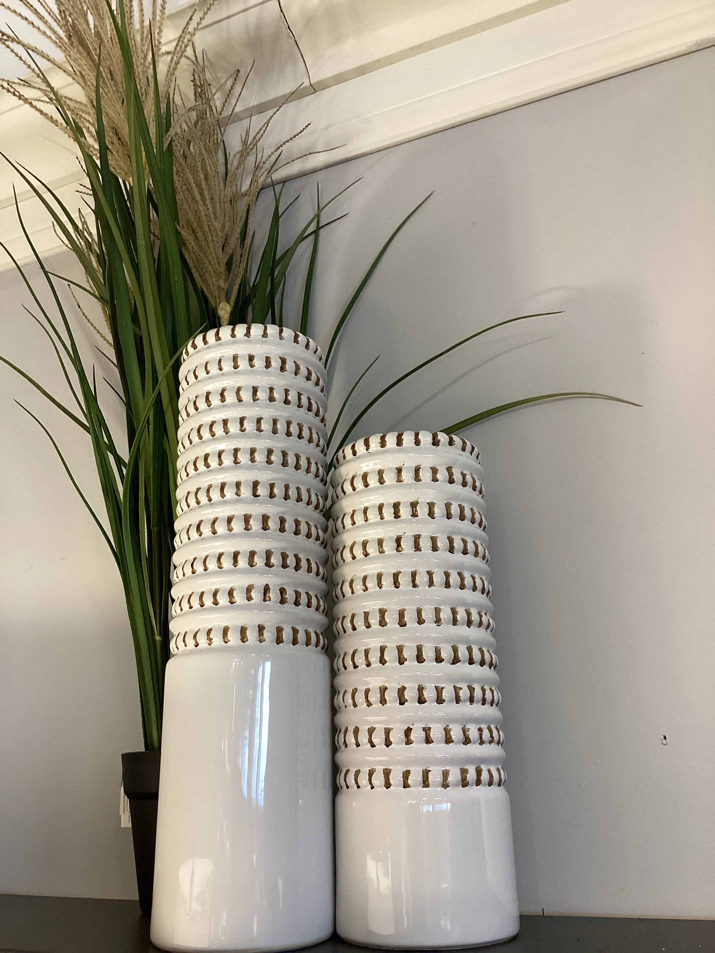 Set Of Two Ceramic Vases Finished In A White Glaze With Taupe Accents, Beaded Texture And A Ribbed Interior. Sizes: S-5x14x5, L-5x18x5