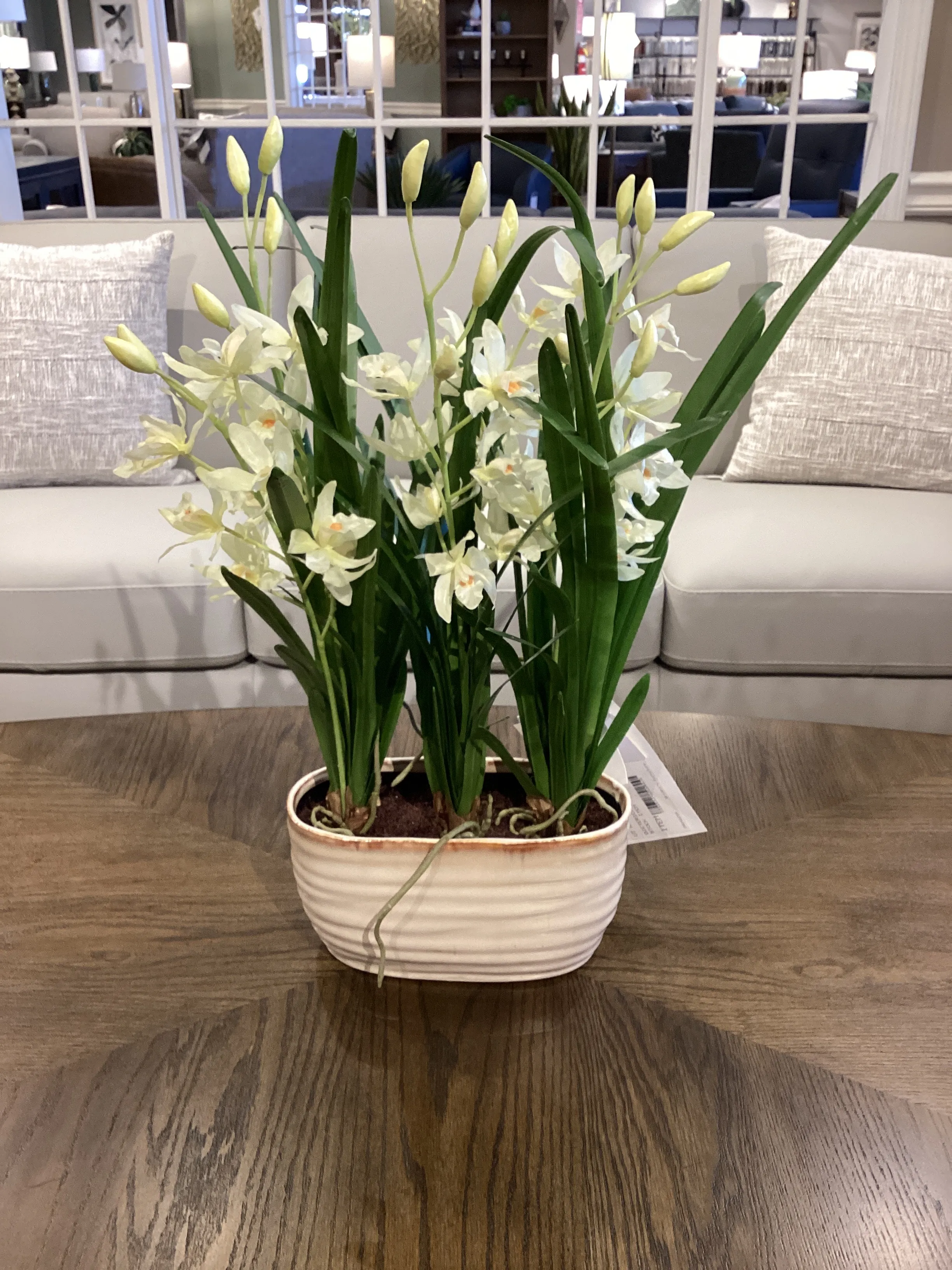 Sprays Of Cream Cymbidium Orchids With Lush Green Foliage Are Nestled Into A Textured, Tan Glazed Ceramic Planter With Faux Soil.