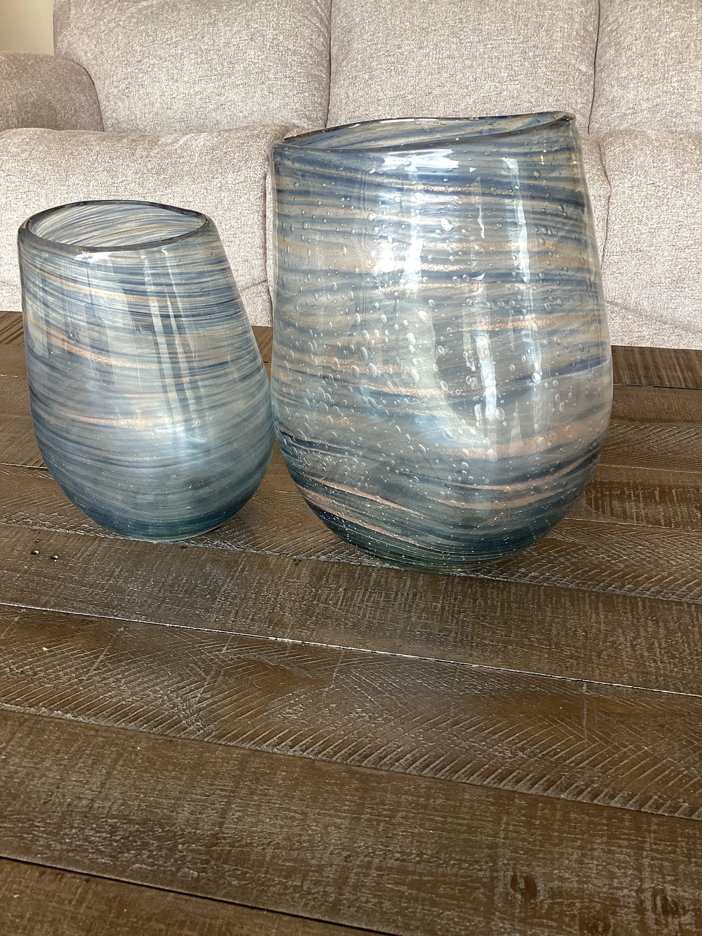 Immerse yourself in the mesmerizing swirled pattern of blue and gold that gracefully adorns these clear bubble glass vases. The delicate dance of colors creates a captivating visual spectacle, making these vases a true statement piece versatile enough to stand alone or to showcase your favorite blooms. Sizes: S-5x8x6, L- 7x9x8