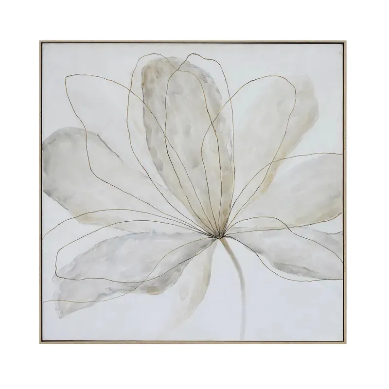 Make a transitional statement with the Minimalist Bloom wall art by Crestview Collection. This captivating artwork portrays the delicate image of a blooming flower, rendered in soft of cream, muted gold, and light gray. Each petal is gracefully painted with a watercolor-inspired technique that gives the flower a soft, airy quality. Adding artistic refinement, fine linework traces the contours of each petal. These hand-drawn accents introduce subtle dimension and movement, highlighting the layered structure of the bloom without disrupting its quiet flow. Framing the artwork is a natural wood frame that provides the perfect finishing touch. Its subtle grain and soft finish add an organic warmth that contrasts beautifully with the cool, airy palette of the canvas. This beautifully executed work of art encourages you to slow down and appreciate the finer details.