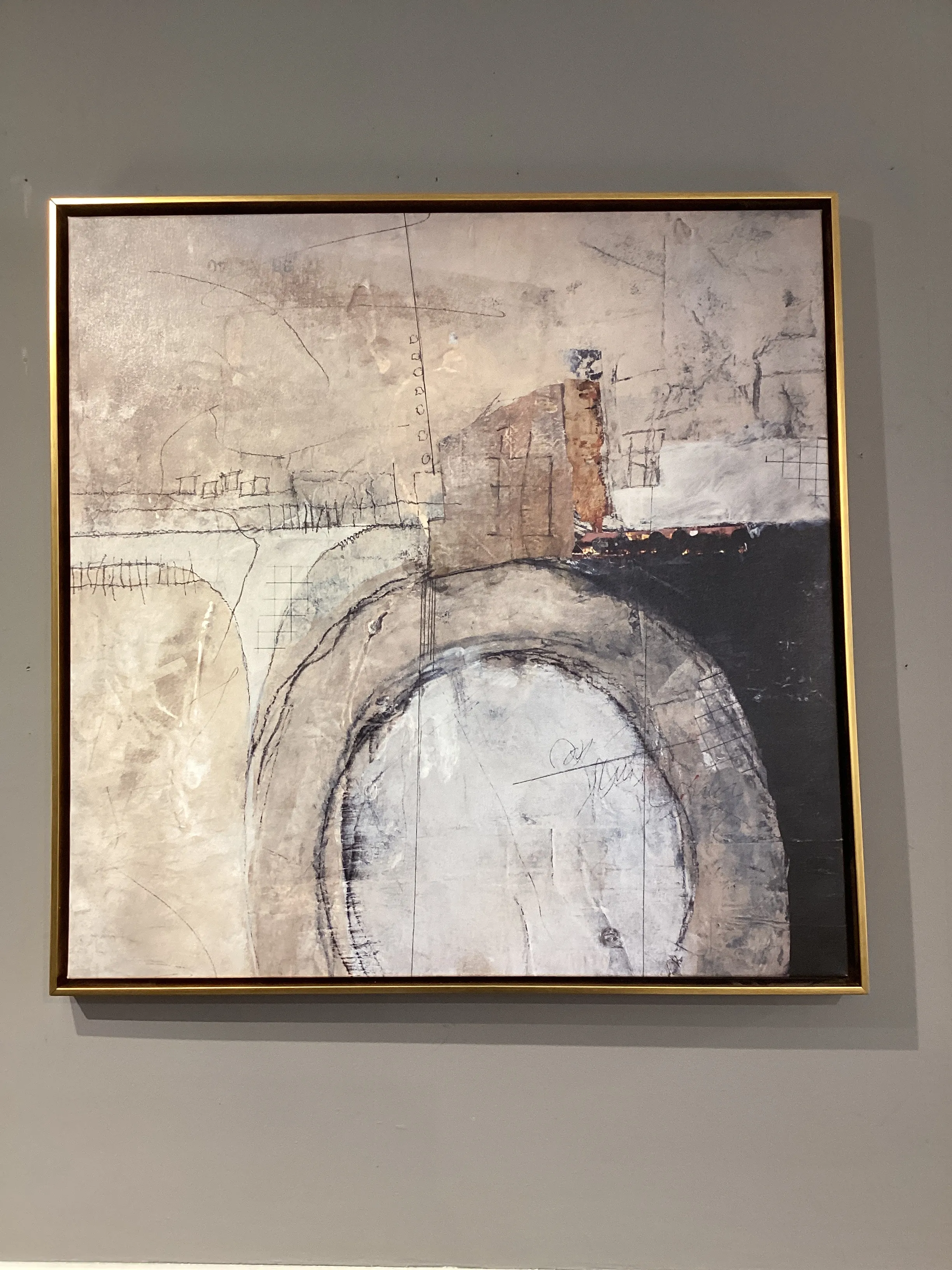 Varying shapes converge in a contemporary form. Canvas is wrapped around wood stretcher bars and mounted in an antique gold wood floater frame.