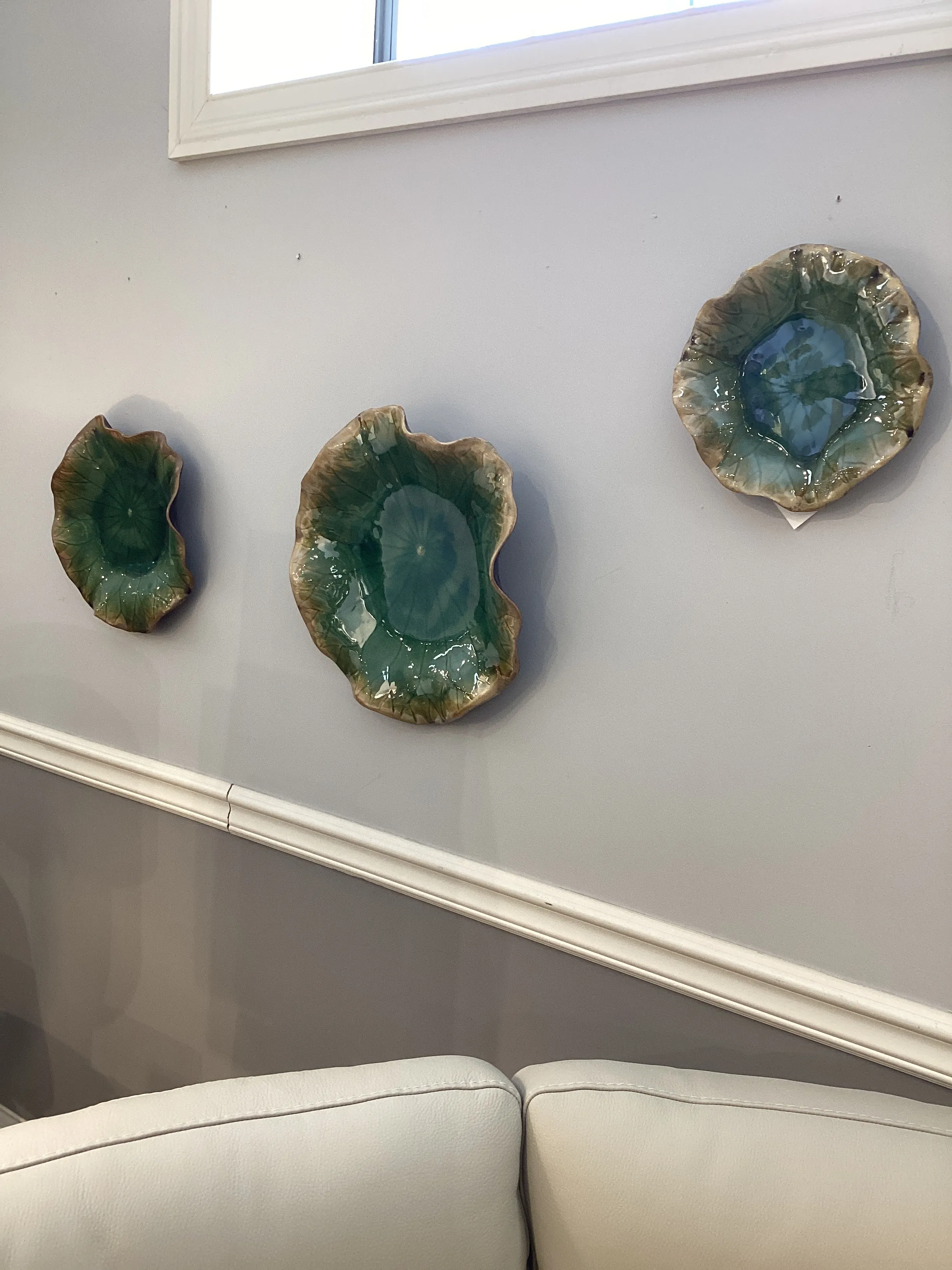 A trio of ceramic flowers with detailed veining, glazed in forest green with brown edges. May be hung on wall or used as tabletop accessory. Sizes: Sm-11x3x11, Med-15x3x15, Lg-18x4x18