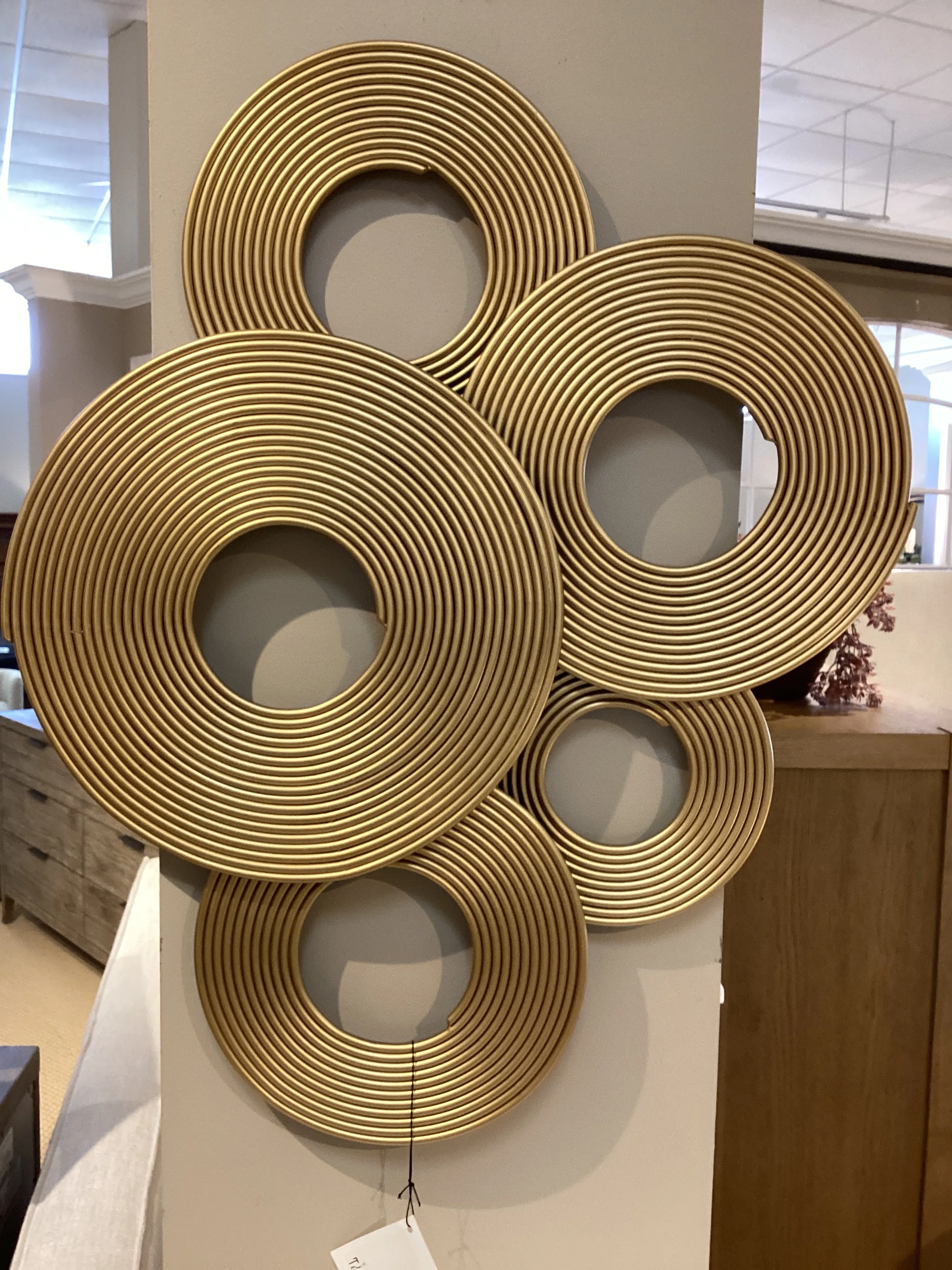 A 3-dimensional Layering Of Spiraled Iron Rings Featuring A Soft Gold Finish. May Be Hung Three Ways.
