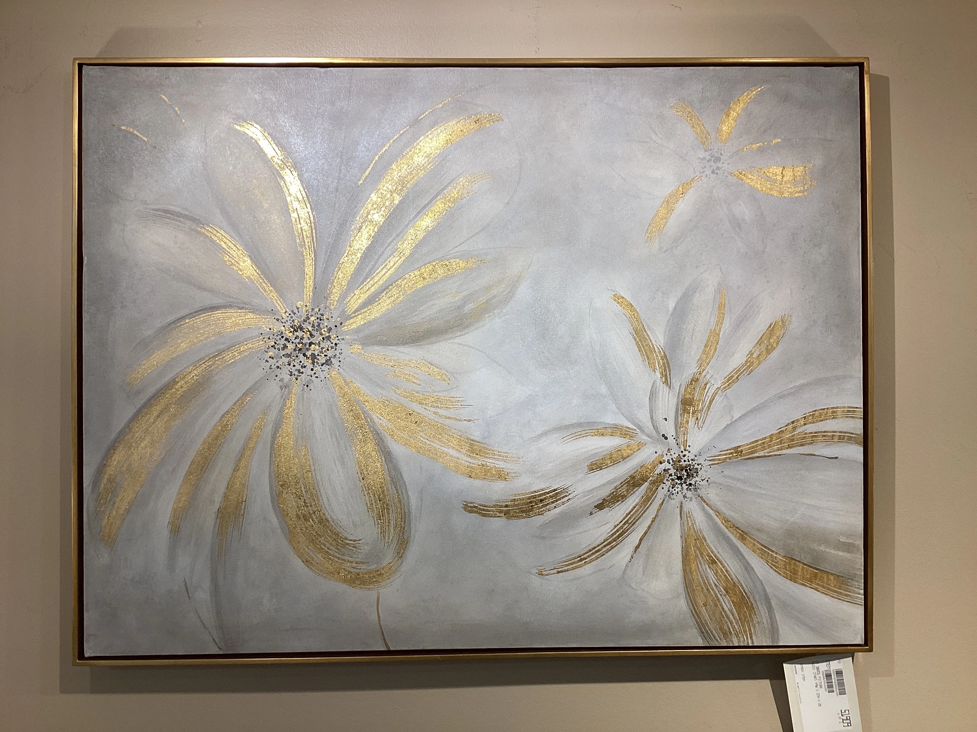 This hand painted, floral artwork on canvas showcases a whimsical design in a sophisticated palette. Light gray and charcoal tones are accented by bright, gold leaf brushstrokes. After being stretched and attached to a wooden frame, each canvas is completed with a petite, gold leaf gallery frame. Due to the handcrafted nature of this artwork, each piece may have subtle differences. This piece may be hung horizontal or vertical.