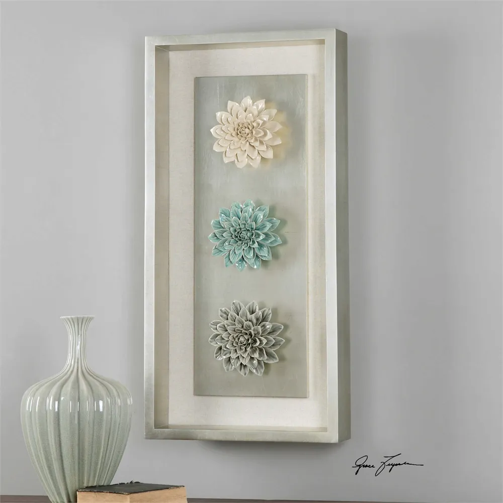 Delightful, ceramic flowers finished in pastels of light blue, light gray, and pale beige are attached to antiqued, silver leaf backboards that are raised up from the oatmeal linen fabric mats. The shadow box style frame is also finished in antiqued silver leaf. Designer: Grace Feyock