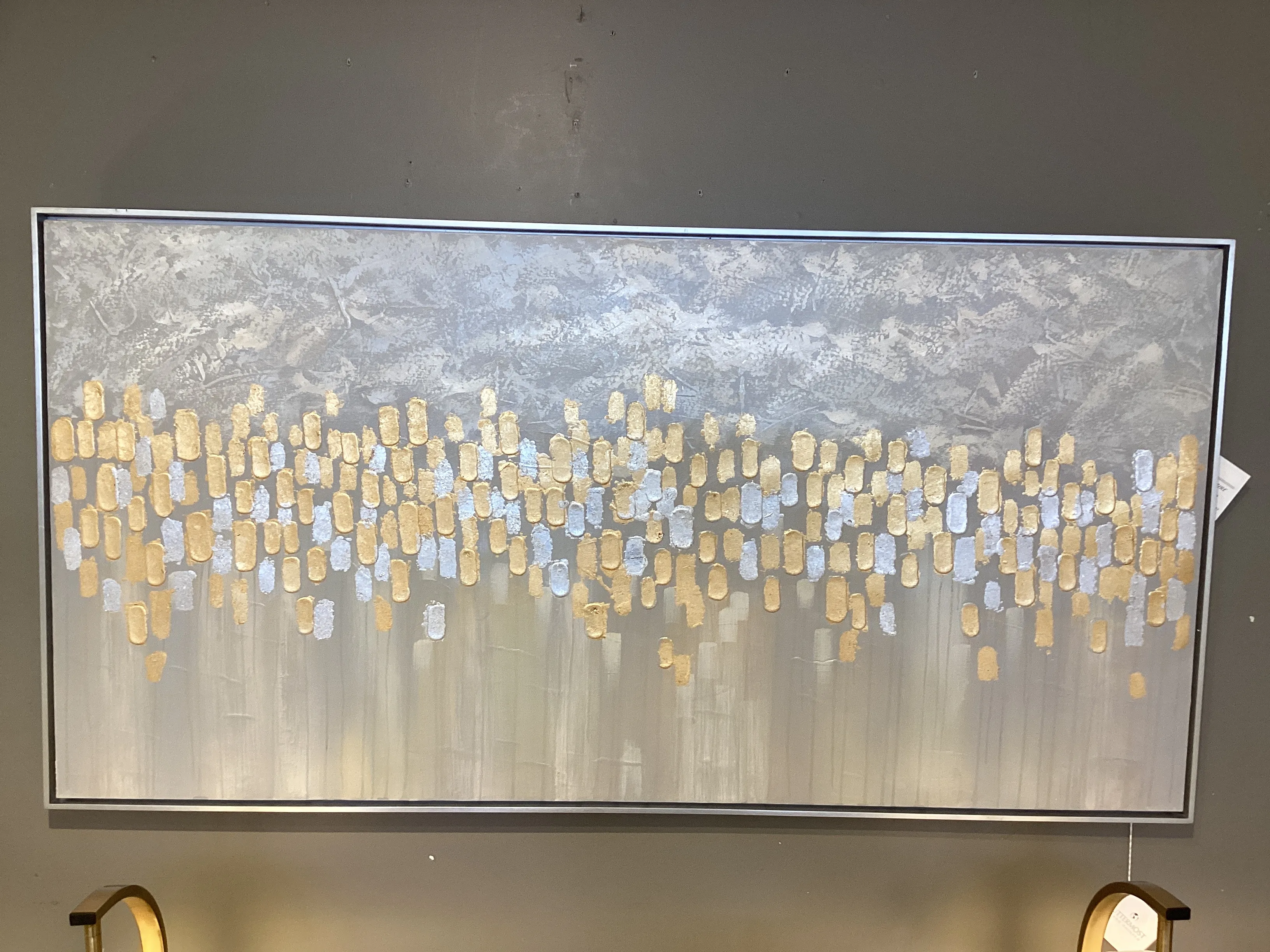 This hand painted artwork on canvas emanates contemporary style, with a modern edge. A textured, gray and taupe background is accented by bright, metallic gold and silver leaf raised bars. The eye-catching abstract is stretched and applied to a wooden frame. A petite, silver leaf gallery frame completes the piece. Due to the handcrafted nature of this artwork, each piece may have subtle differences. Designer: Grace Feyock