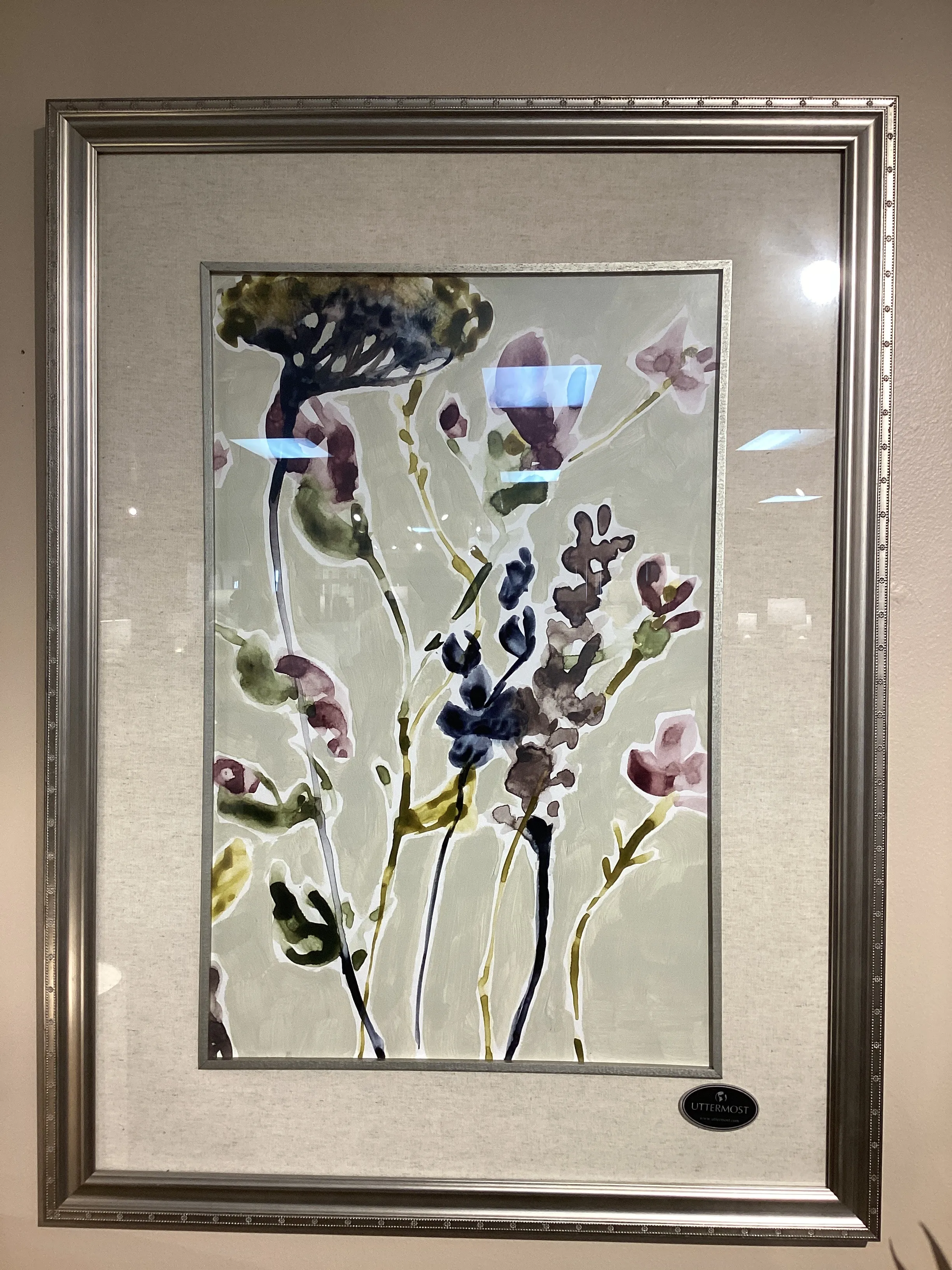 This modern take on a floral design utilizes cool-toned colors in a watercolor style. Each art print is accented by a beige linen mat. Wooden frames with an antiqued silver leaf finish and a black wash and matching fillets complete each piece. Each print is set under protective glass.