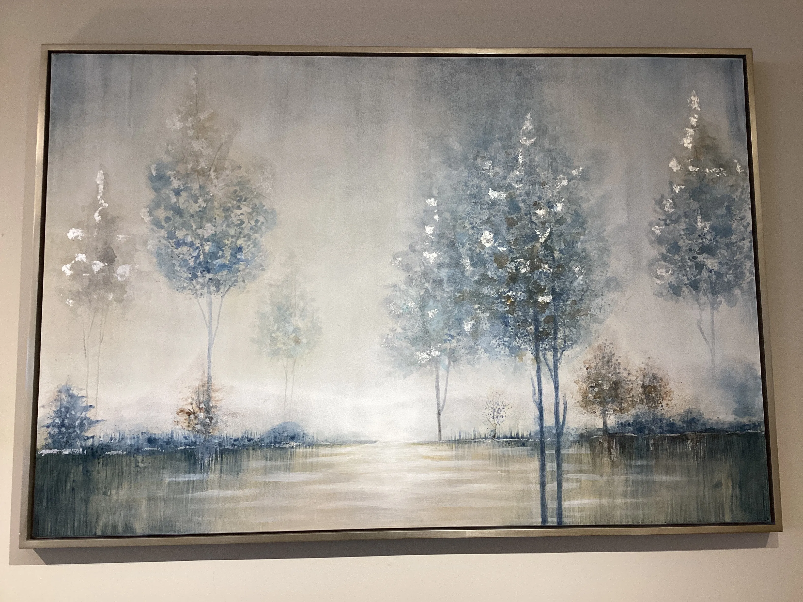 Reminiscent of a snowy lake, this hand painted landscape on canvas presents cool tones in a subdued palette. Icy blue, light gray, and charcoal shades are accented by bright, silver leaf dabbed brushstrokes. This canvas is stretched and attached to wooden stretching bars. A petite, silver leaf frame compliments this contemporary art. Due to the handcrafted nature of this artwork, each piece may have subtle differences.
