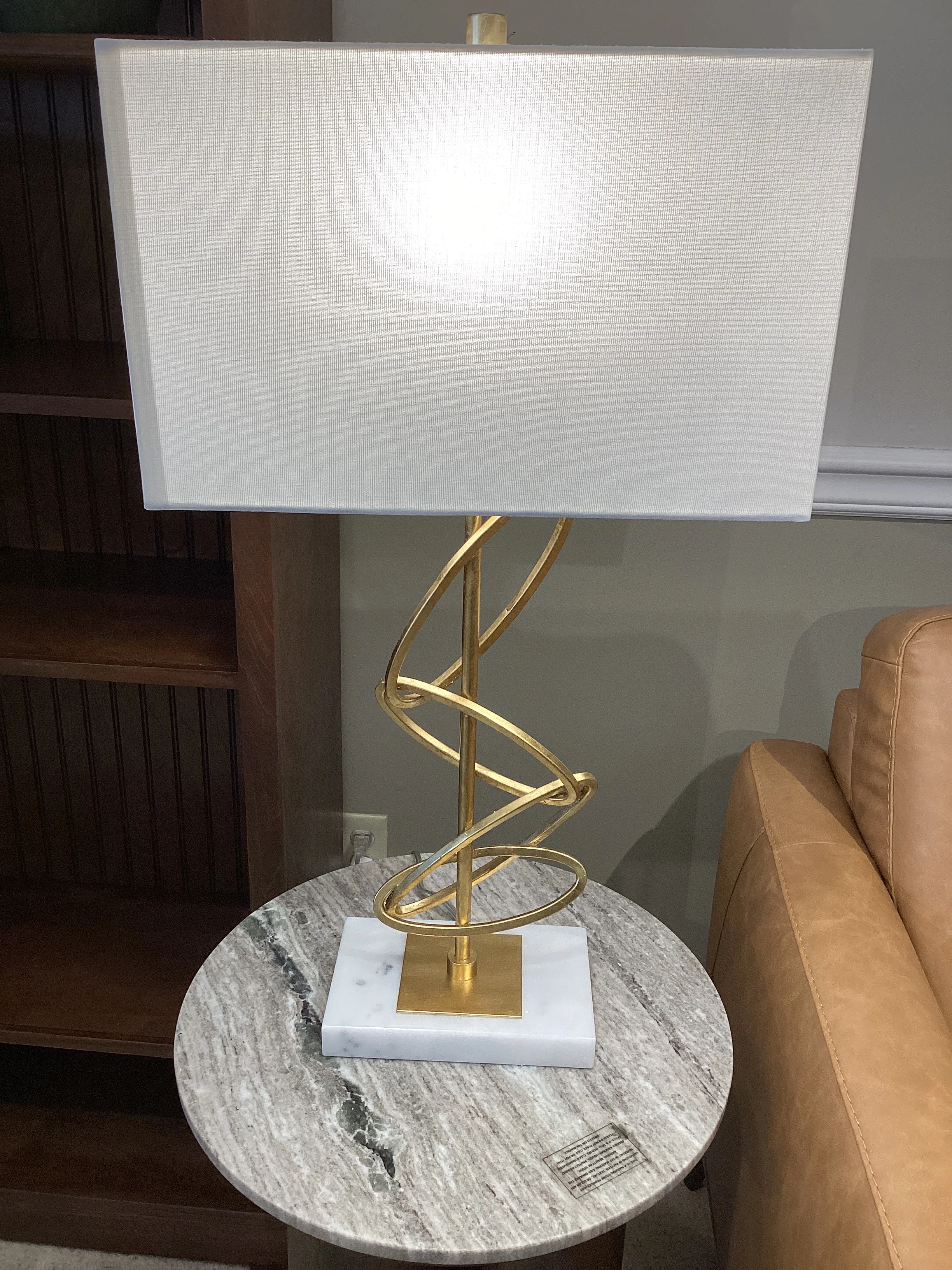 The Ringo Table Lamp by Crestview Collection features rings of gilded gold linked together that appear to be suspended in mid air. They are secured to a center rod and mounted on a grey marble base. The white linen rectangular shade completes the design.