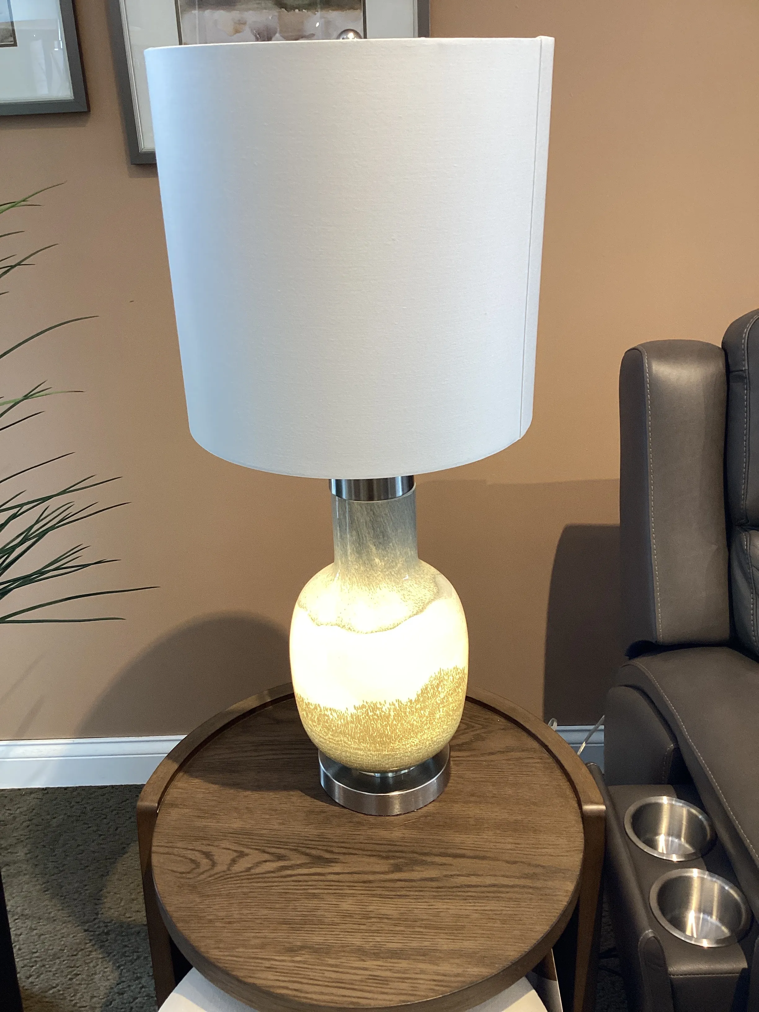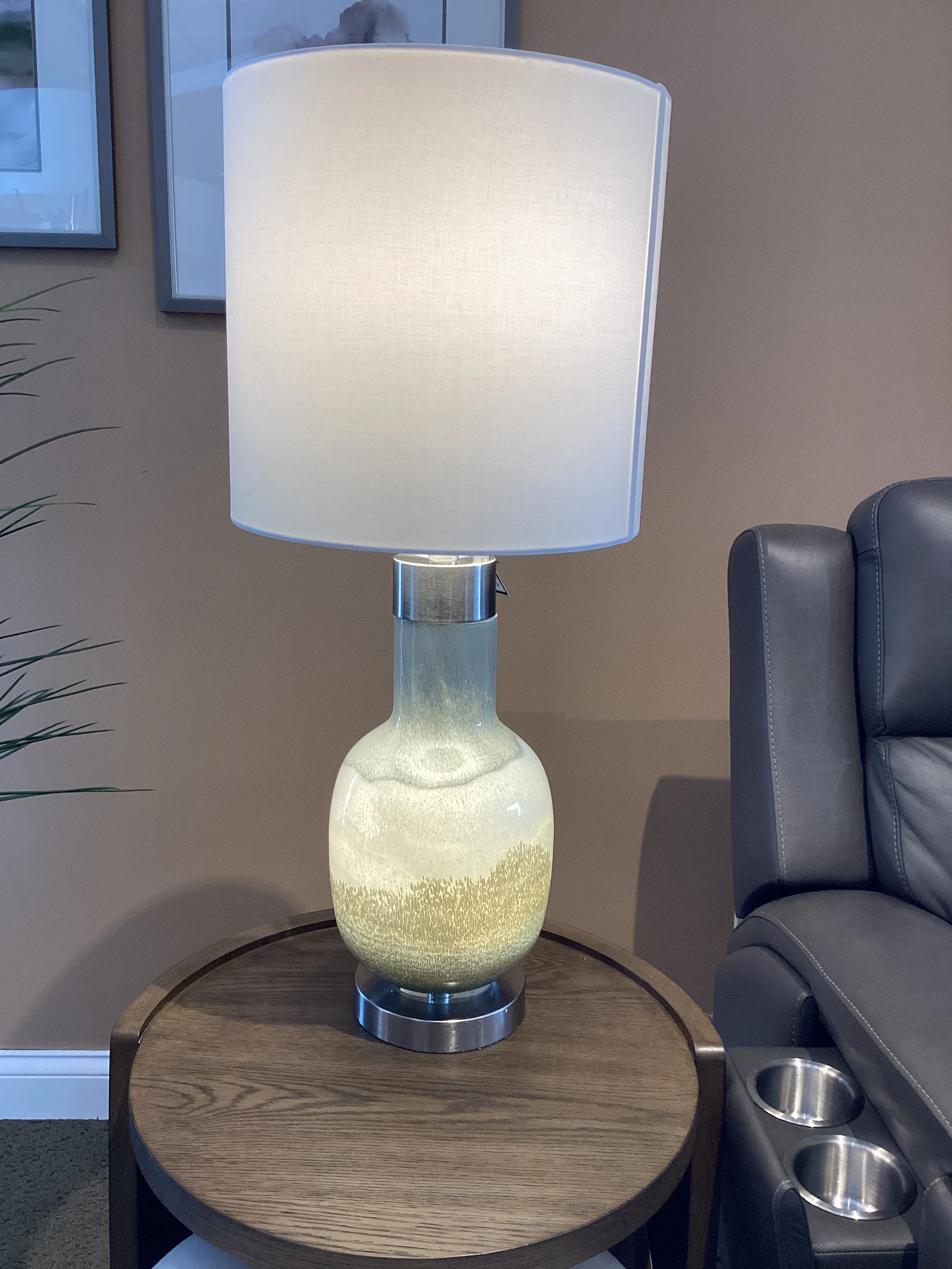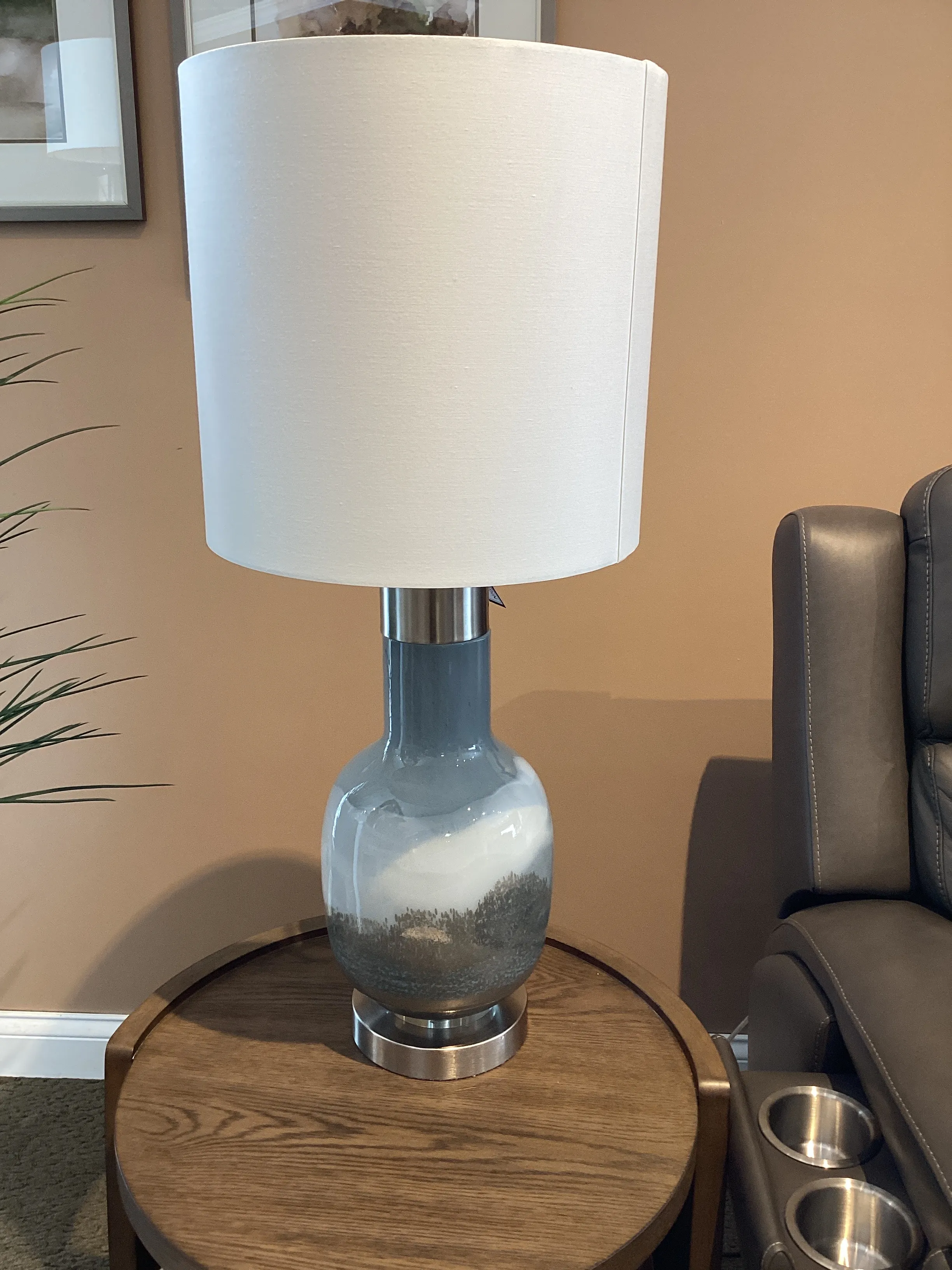 The Crestview Collection Saluti Table Lamp resembles layers of multi-colored sand in a bottle. The body is made of blown glass with brushed steel accents. An ombre design of blue and gray gives it a subtle, coastal feel. A white linen cylinder shade completes this transitional accent piece.