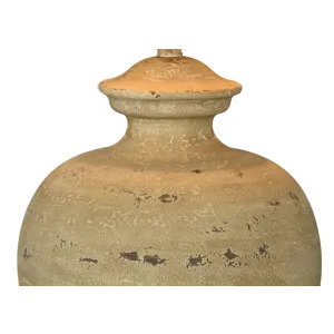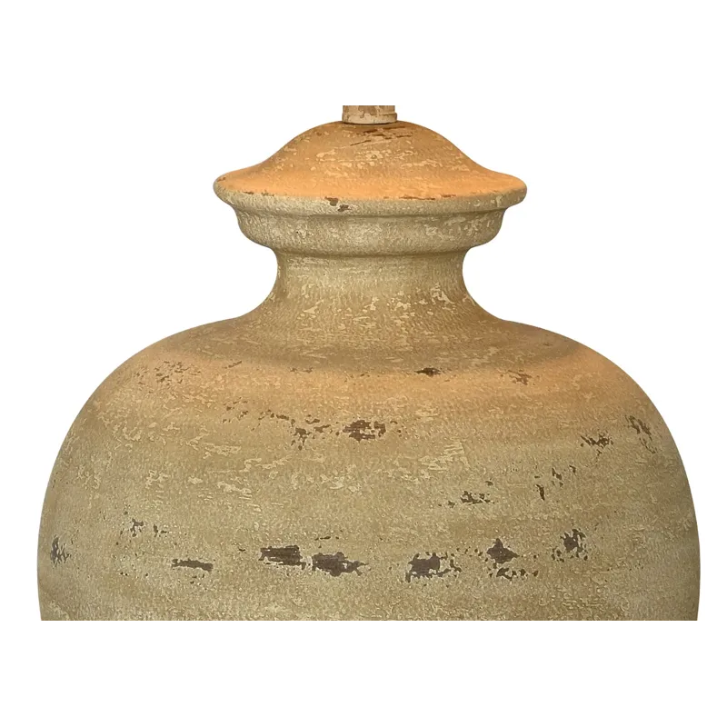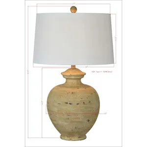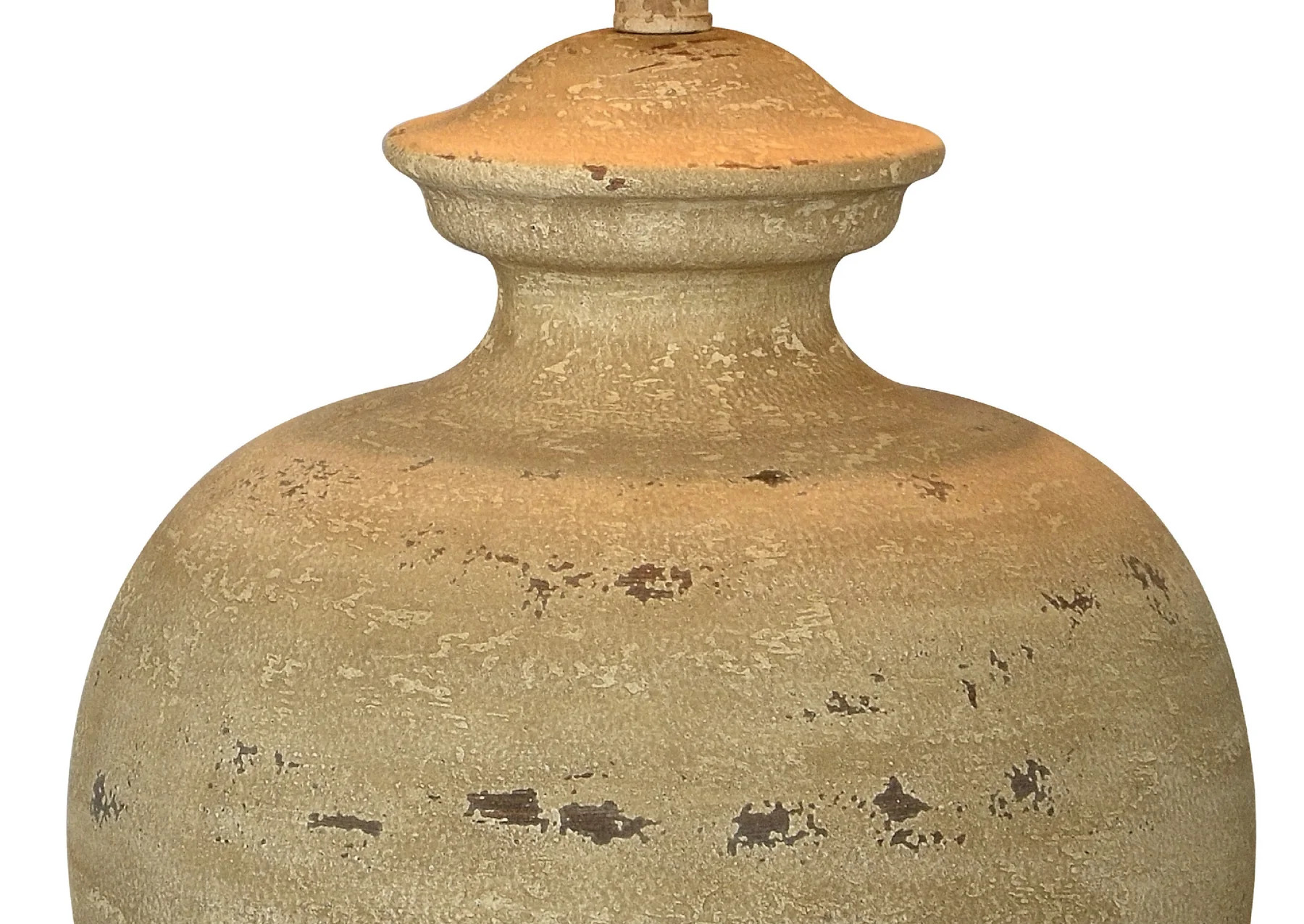 Memphis Table Lamp - Experience a modern reinterpretation of timeless elegance with this oversized ginger jar-style lamp base. Infuse your space with sophistication and depth with this large beige table lamp, boasting warm beige tones subtly accented by light brown distressing. Paired with a crisp white hardback drum shade, this lamp creates a striking contrast that adds a contemporary flair to any room.