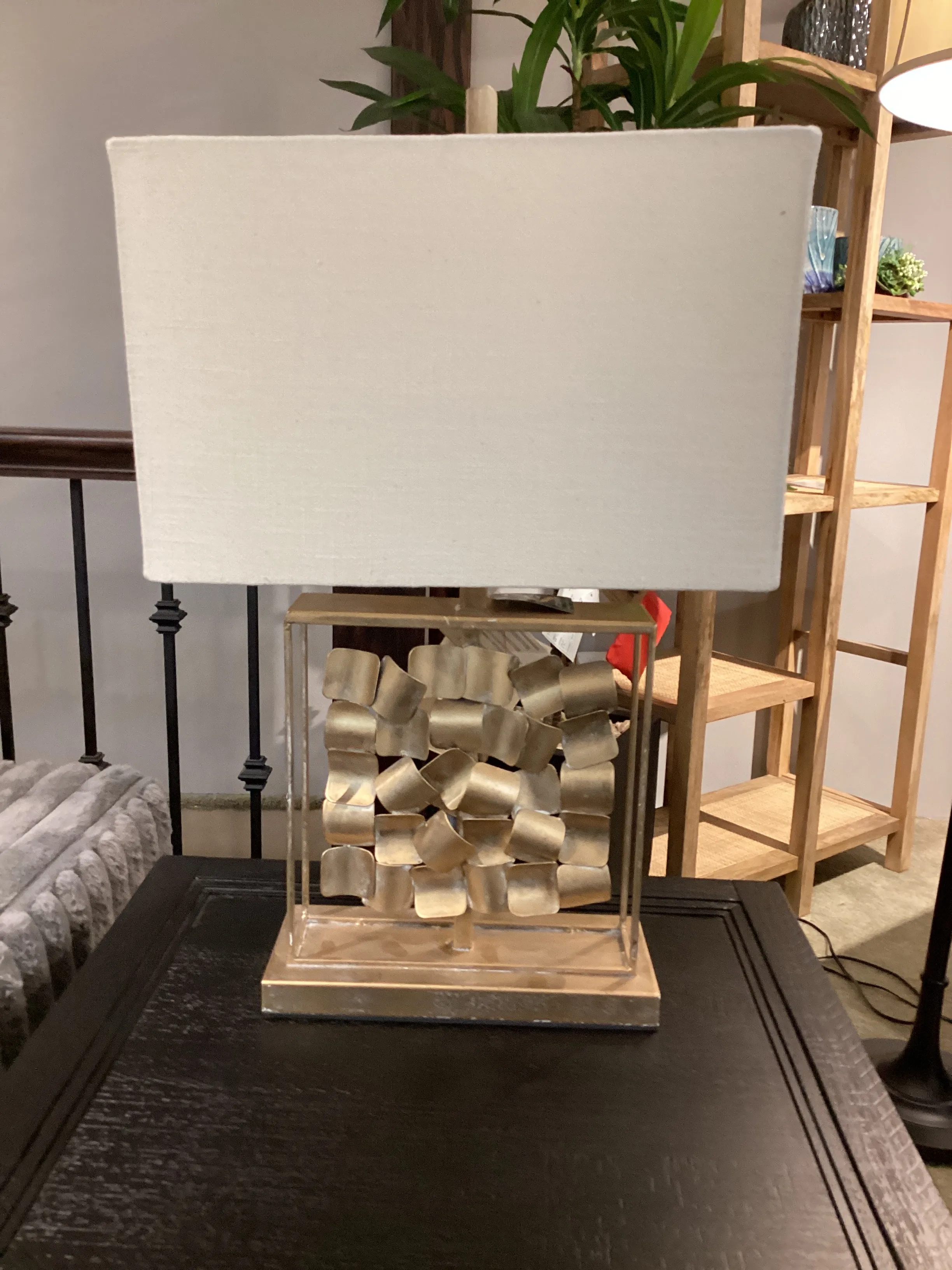 Ready for something different? This table lamp is happy to oblige. Goldtone blocks float in a minimalist, open-work design that's equal parts contemporary and chic.