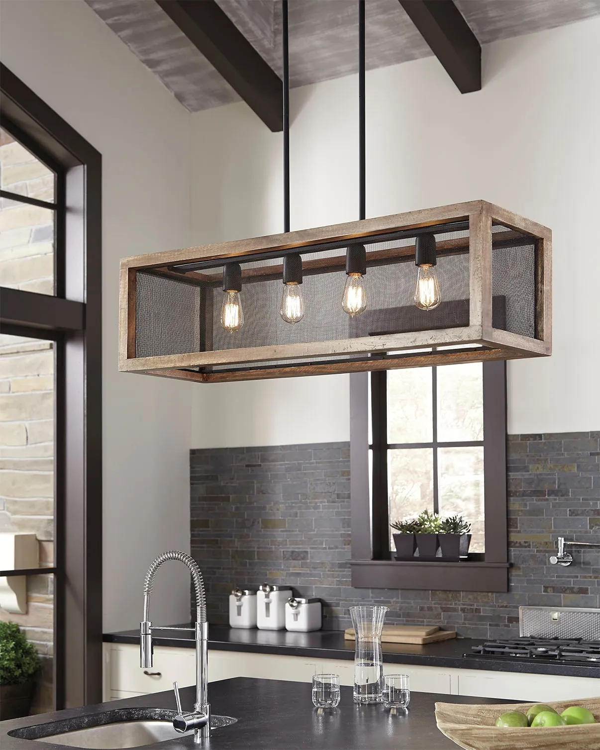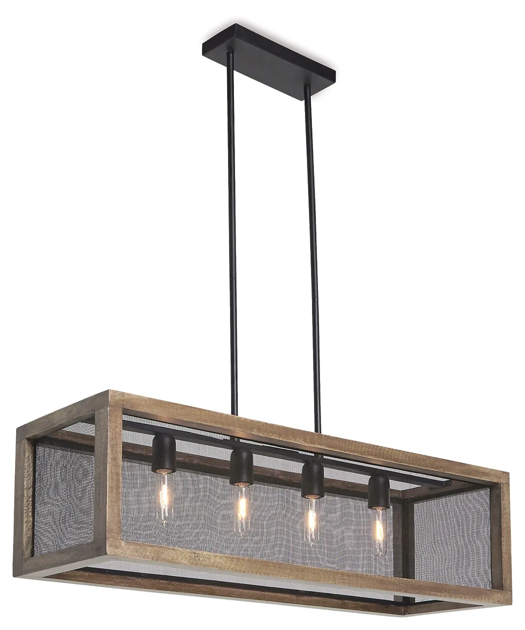 Delightfully chic over a dining room table, breakfast bar or kitchen island, this rectangular pendant light is a clear winner for form and function. Adjustable height rods make it that much more accommodating. Incorporation of naturally finished wood and metal bring an earthy sensibility to light.