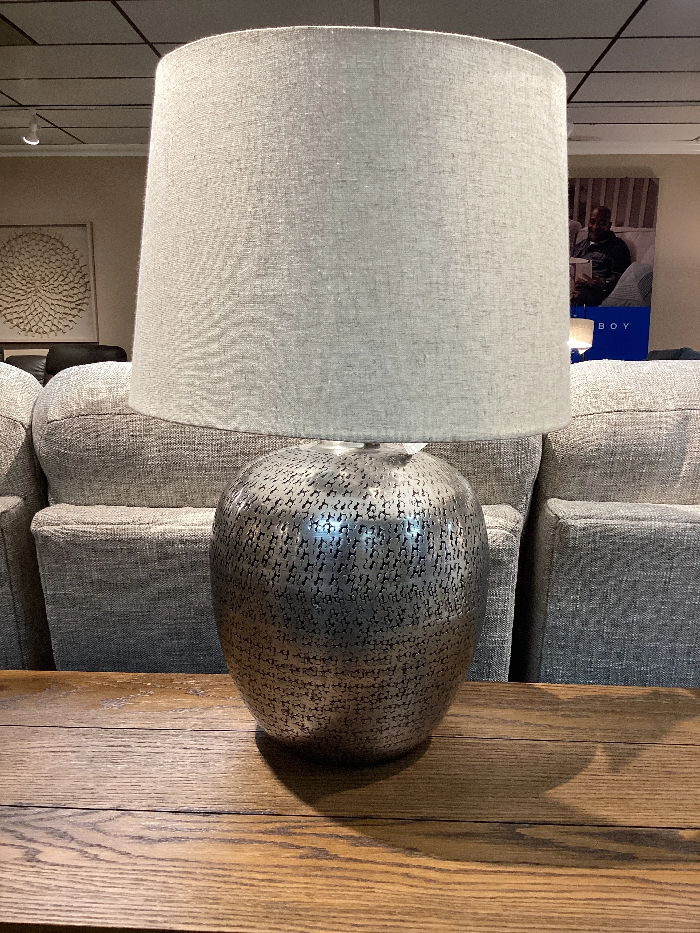 Stay trendy with hammered aluminum that exudes urban refinement. This table lamp's silvertone sheen will fill any space with well-lit splendor.