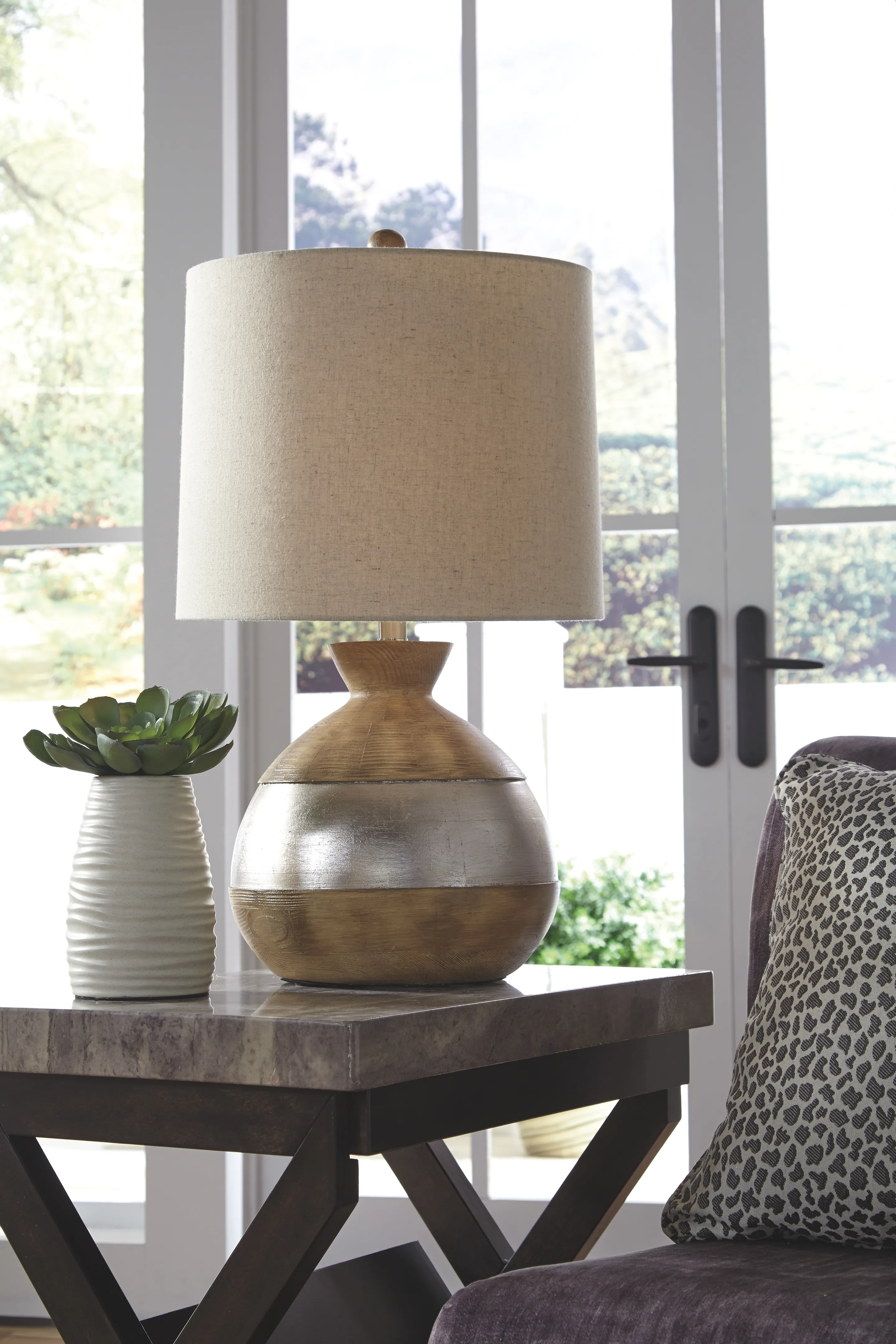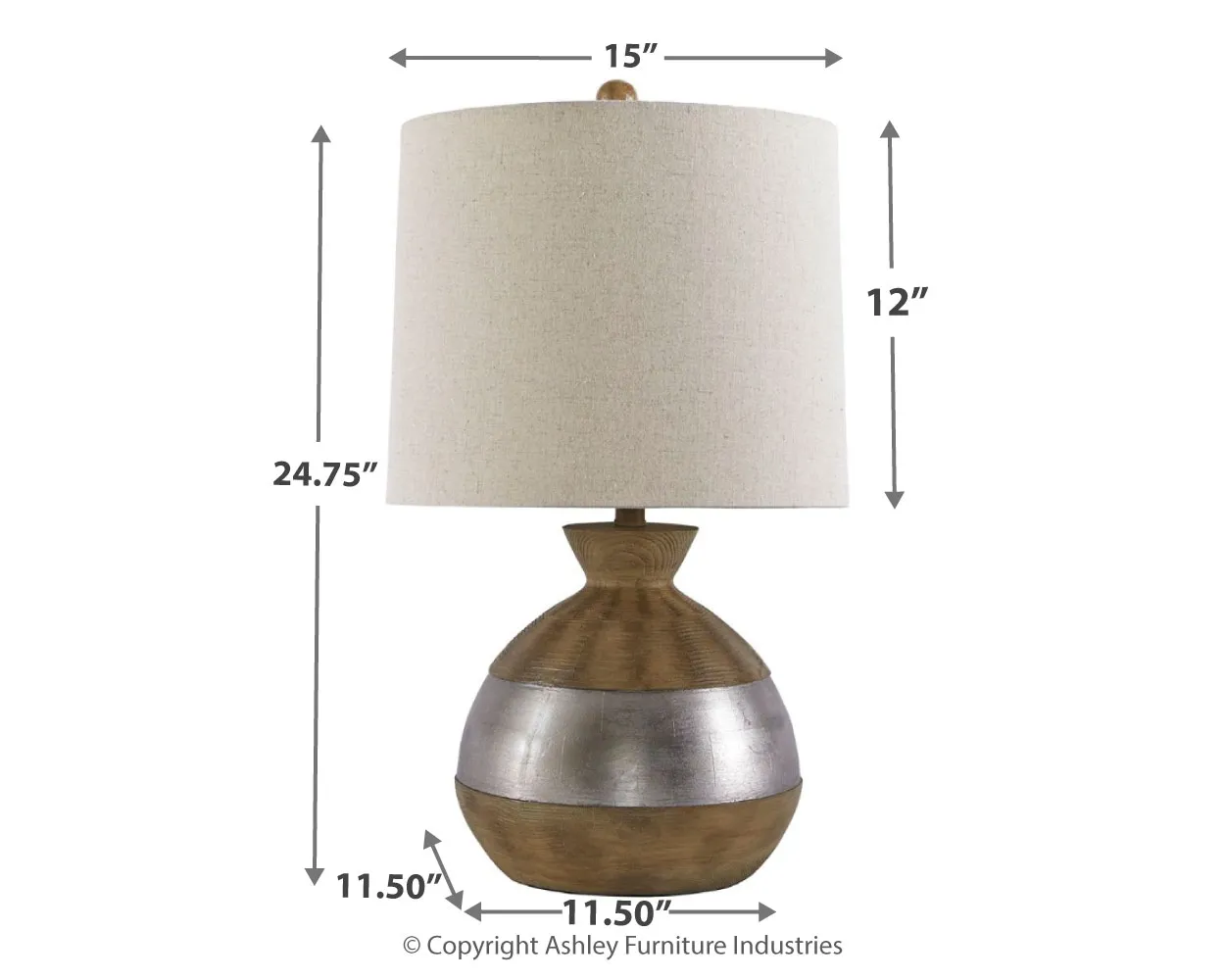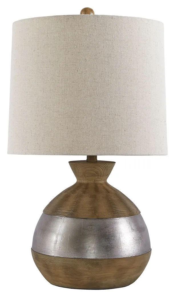 Find the silver lining. Sporting a luminous silvertone band for distinctive flair, this faux wood table lamp is earthy glam at its best. Simply chic drum shade keeps the aesthetic fresh and clean.