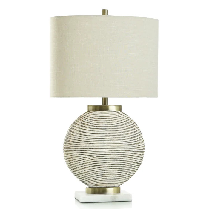 SHALLOWS BRASS TABLE LAMP | Curved Cream Striped Polyresin Body with White Marbled Base | 30in ht