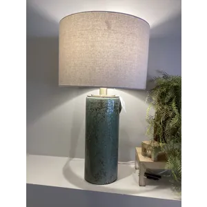 Add a touch of bohemian flair to a space with this unique table lamp. The ceramic base features an organic textured base finished in a distressed dark teal glaze, paired with polished nickel accents and thick crystal details. The hardback drum shade is white linen fabric. Due to the nature of fired glazes on ceramic lamps, finishes will vary slightly.