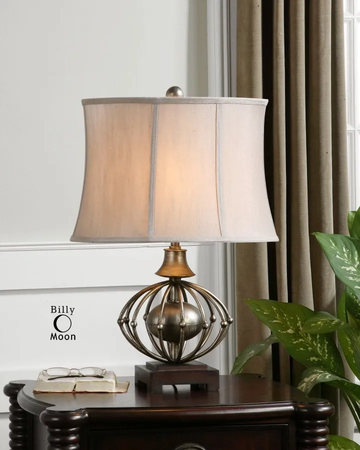 Hand forged metal finished in heavily antiqued silver with black undertones and a dark bronze foot. The oval semi bell shade is a silver taupe fabric with natural slubbing.