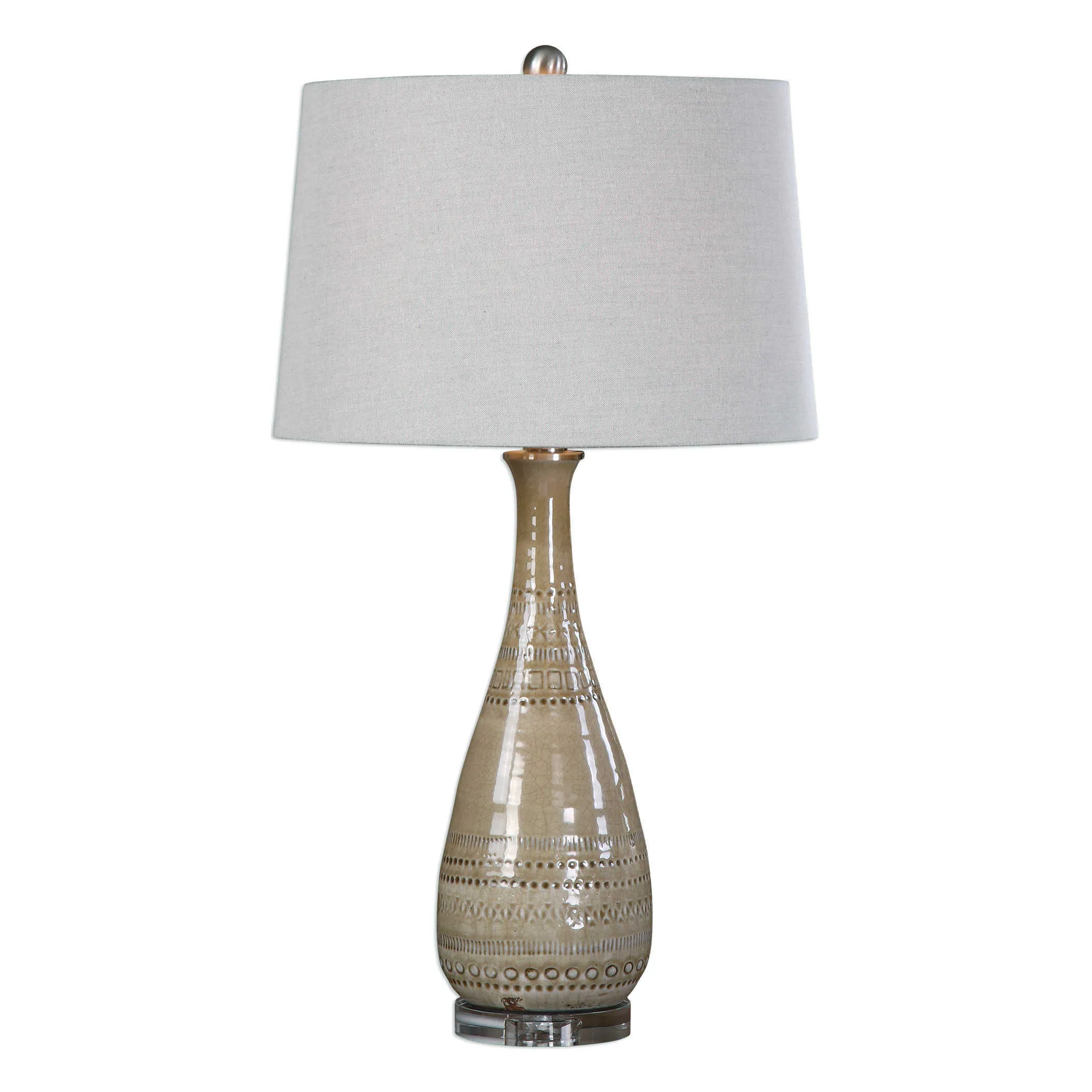 Embossed ceramic finished in a light taupe glaze accented with plated brushed nickel metal details and a thick crystal foot. The tapered round hardback shade is a light gray linen fabric. Due to the nature of fired glazes on ceramic lamps, finishes will vary slightly.