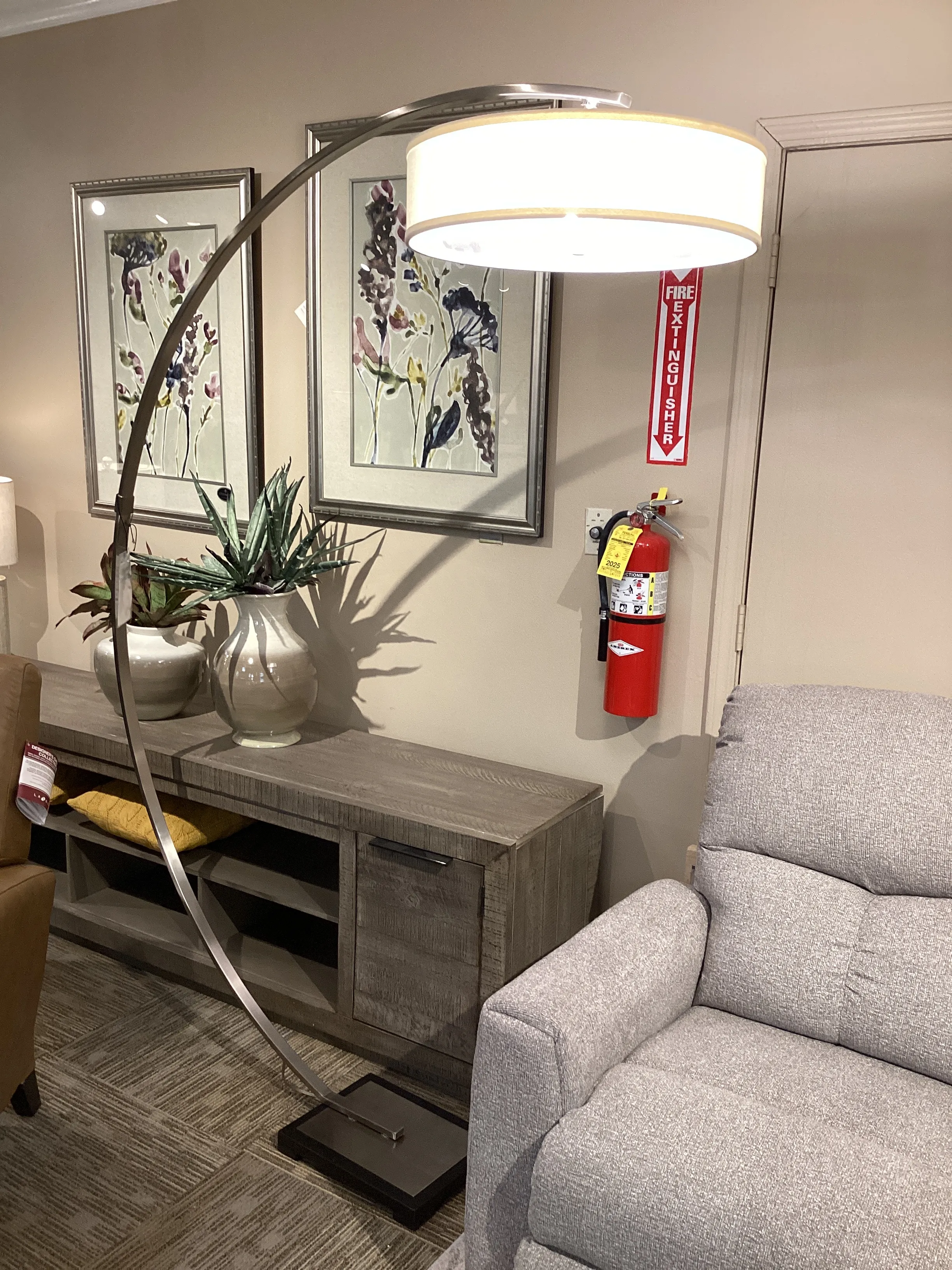 Brushed nickel plated metal with an extreme arc accented with a matte black foot. The suspended round drum shade is an off-white linen fabric with light slubbing.