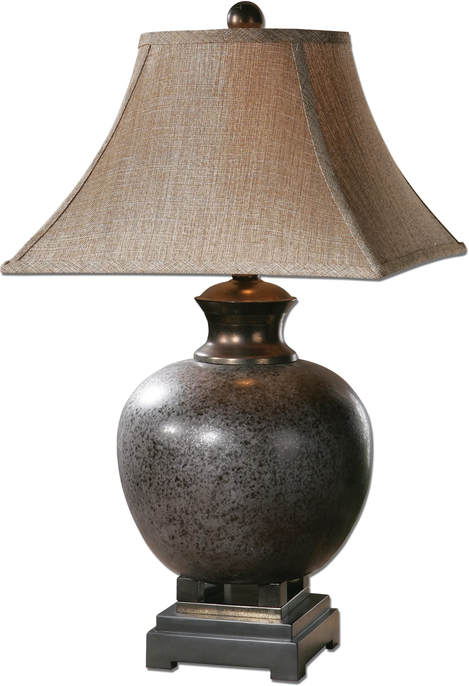 Mottled, rust brown glaze with black accents and dark bronze details. The round top, square bottom bell shade is a taupe linen fabric with black striations. 9H, SHADE 10H X 16 DIA. (IN)