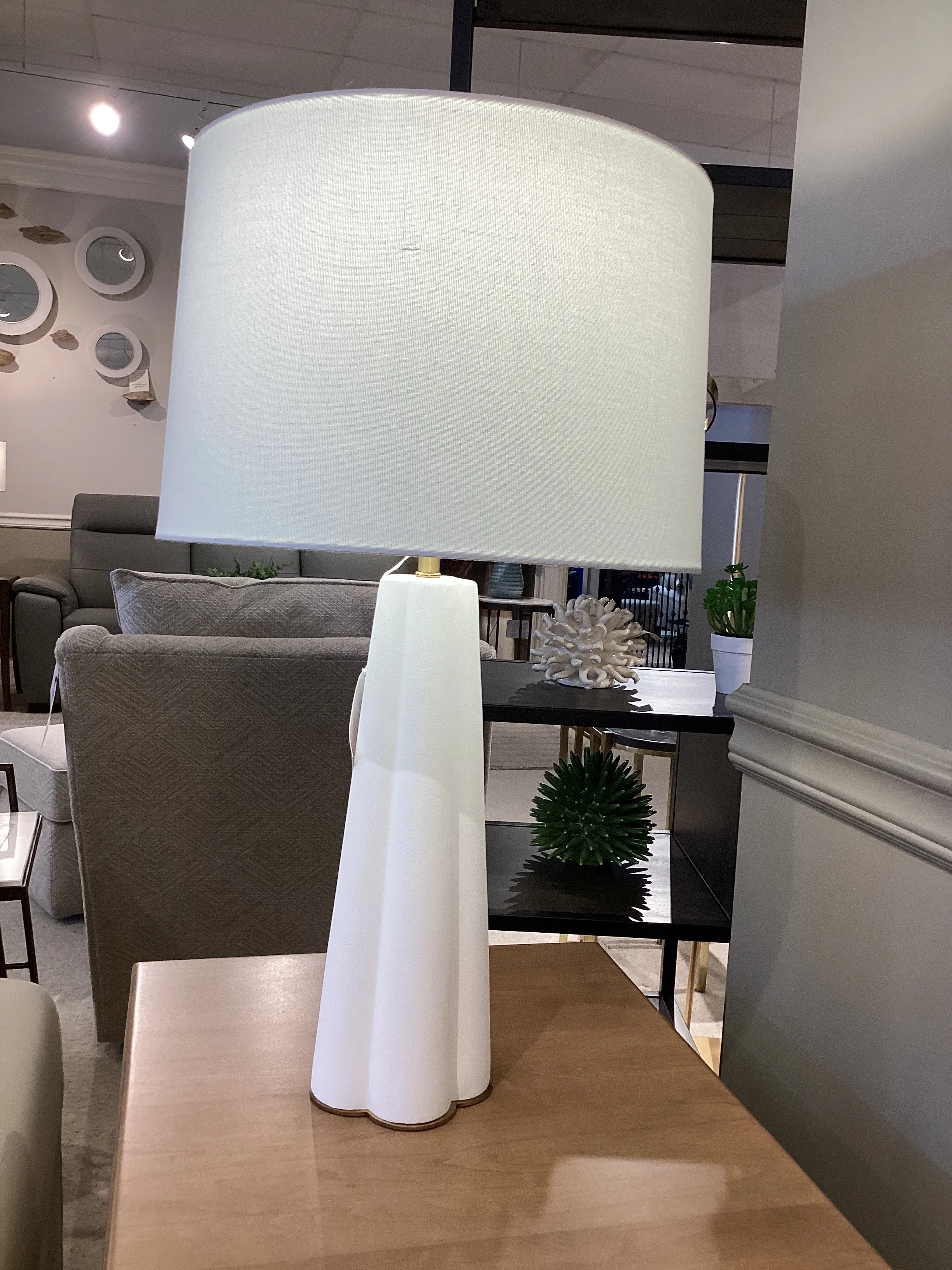 A satin white glaze accentuates the clover shape of this beautiful ceramic table lamp. The lamp's soft curves sit atop a gold plate that mimics the design. A slightly tapered white linen shade completes the look.
