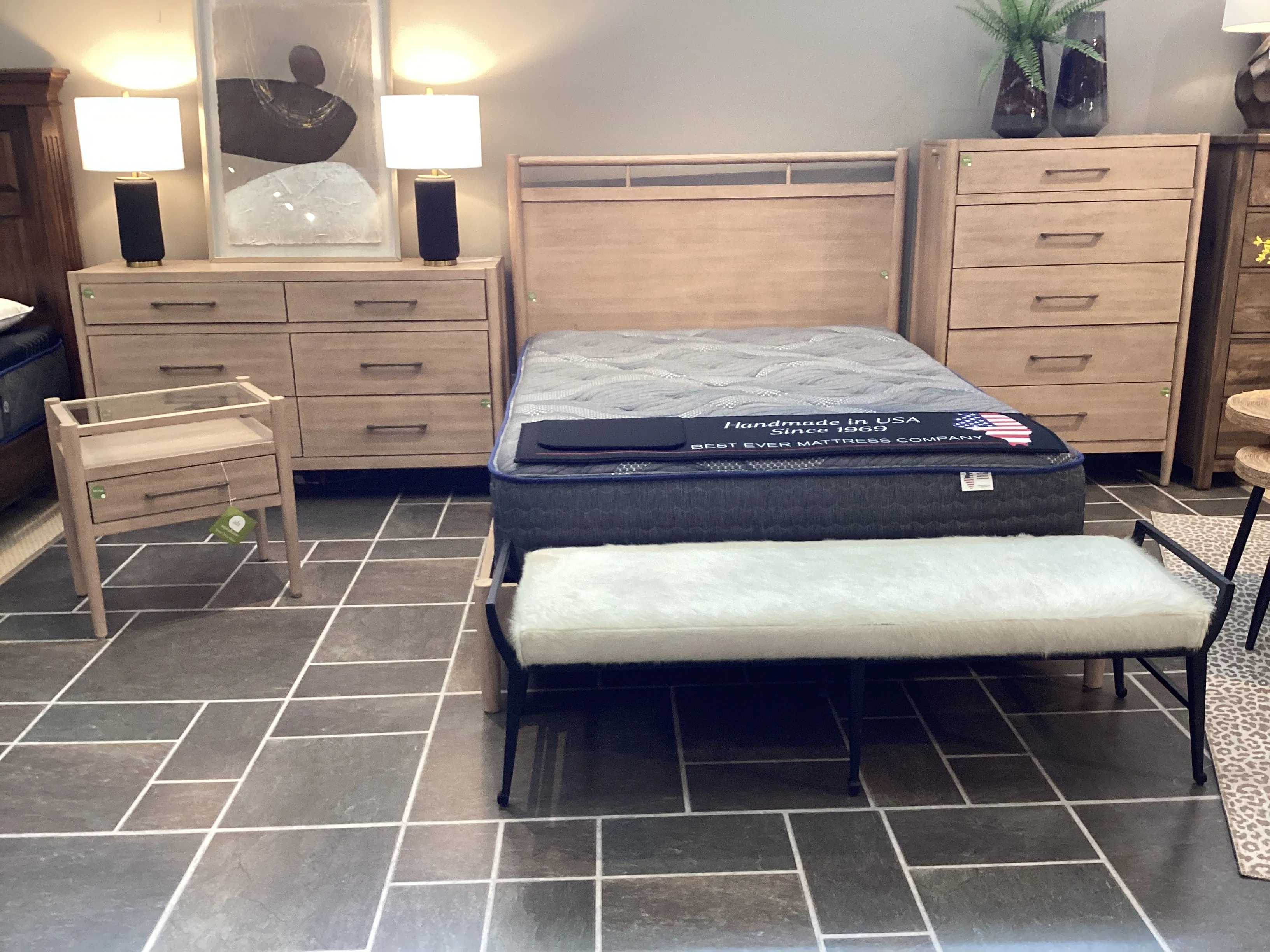 This transitional style bedroom collection comes in a natural Champagne finish complimented by hardware in a soft aged bronze finish. Enjoy elegant, rounded legs and details reminiscent of beloved mid-century designs with features such as power outlets, felt & cedar lined drawers and so much more.