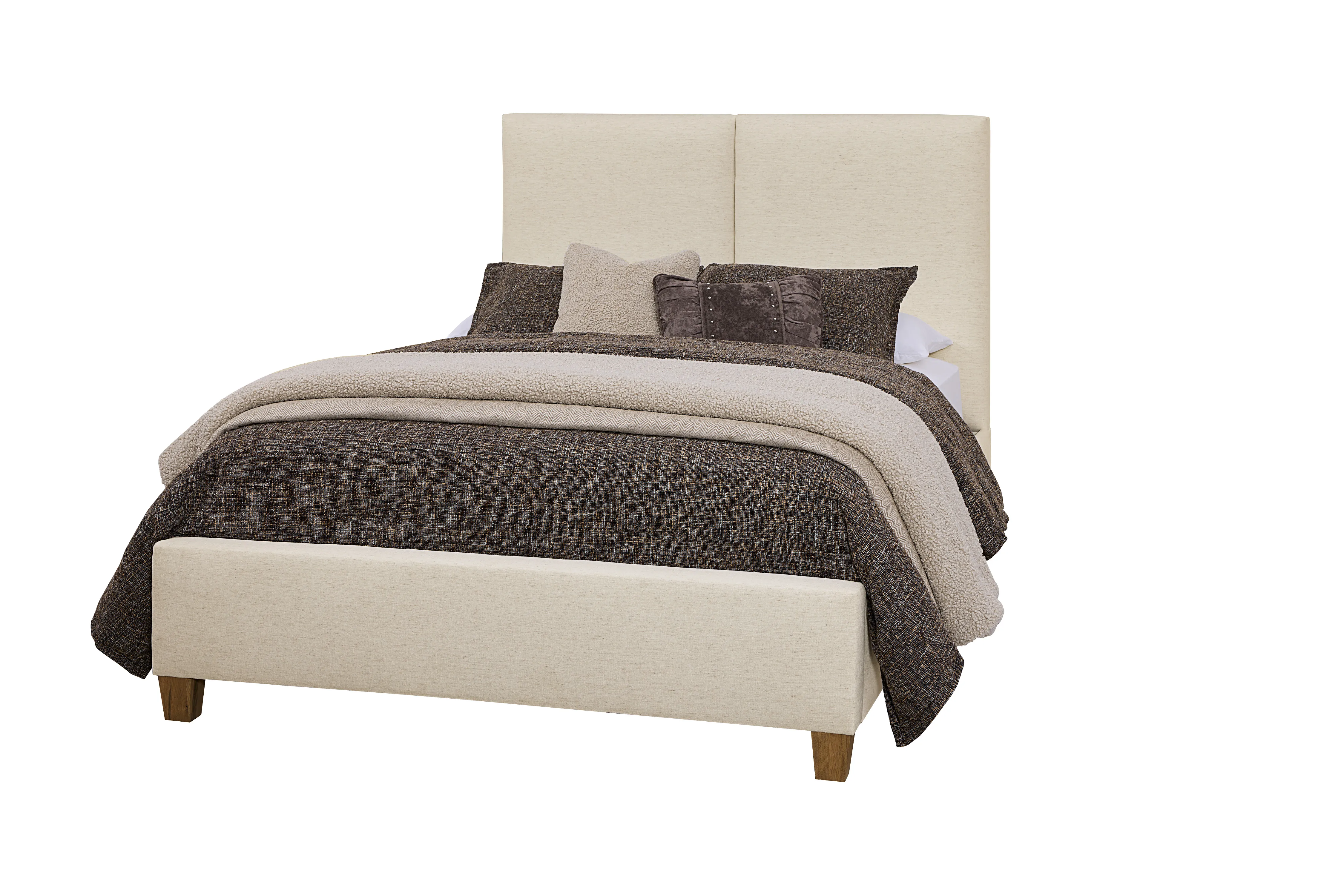 Luxury upholstered bed featuring simple lines and gently rounded corners. Available in three fabrics and three wood leg finishes to complement any decor. It is upholstered in high-quality Revolution Performance fabric and padded with comfortable foam. It is available in Queen and King sizes.