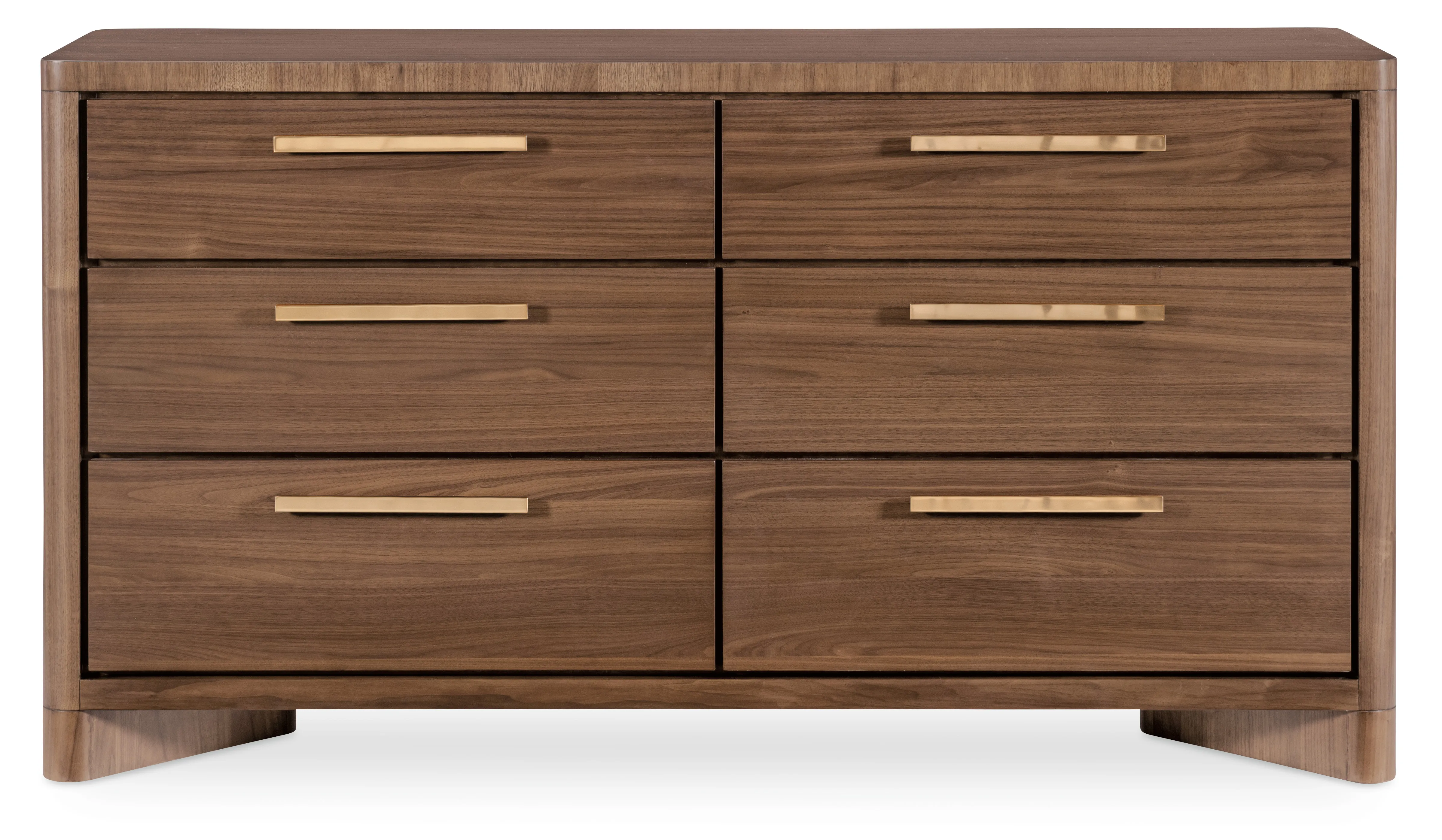 The Eleana Dresser exudes timeless sophistication with its Light Caramel walnut veneer finish and plated Sunlit Bronze hardware. Designed with six self-closing drawers, a jewelry tray, and cedar-lined bottom drawers, it offers elegant organization. Soft, rounded corners enhance its sculptural silhouette, making it a standout piece for transitional bedrooms.
