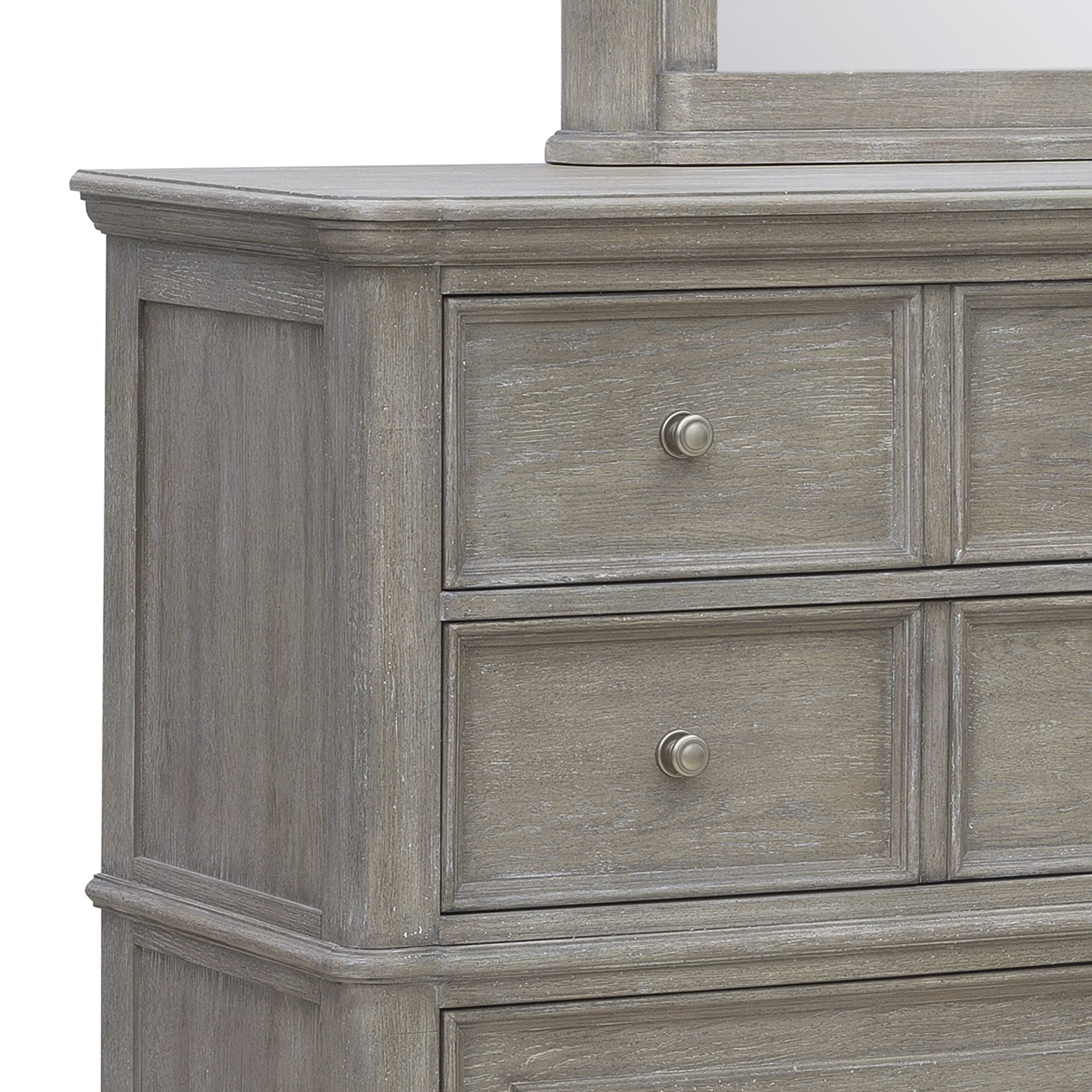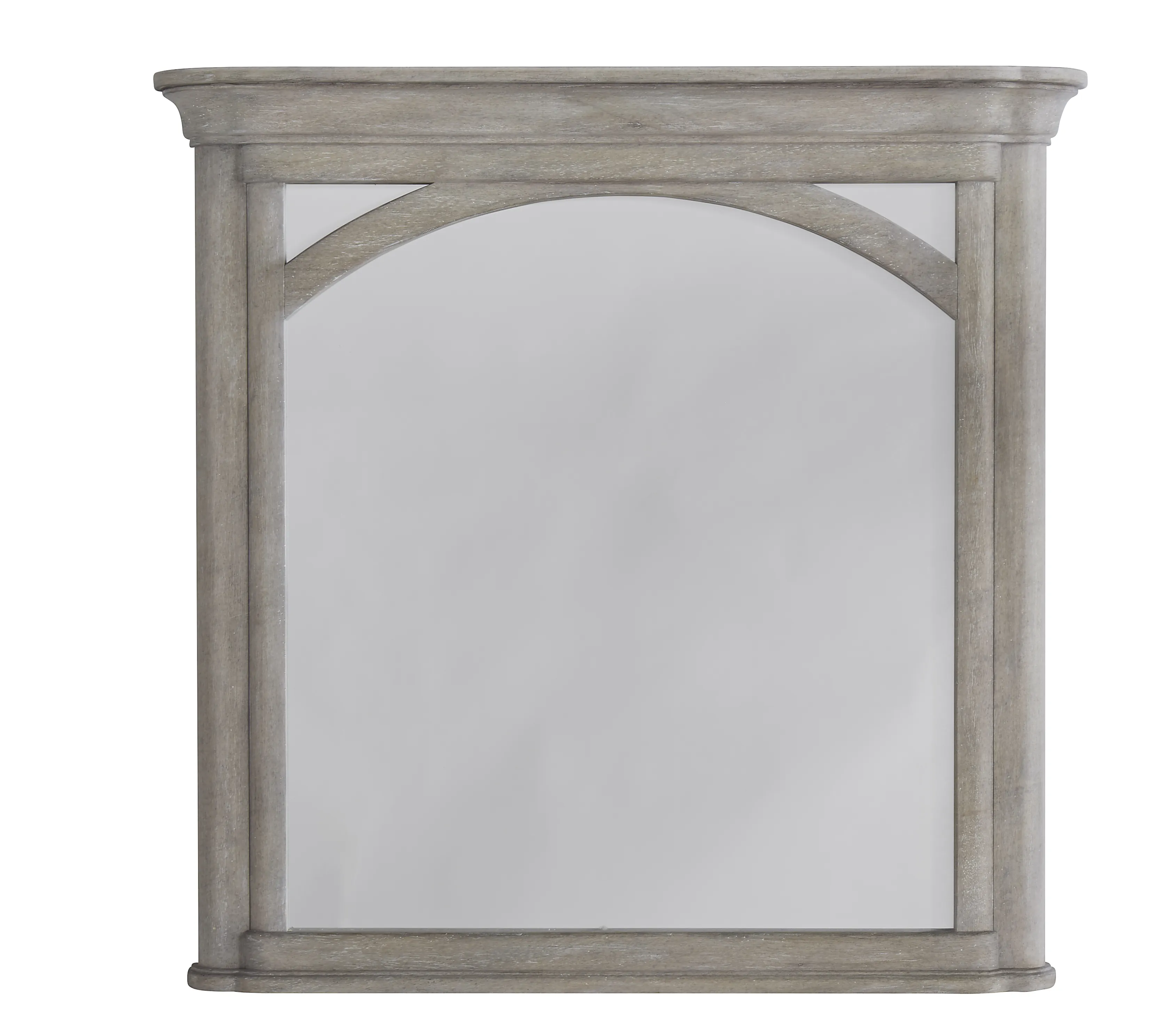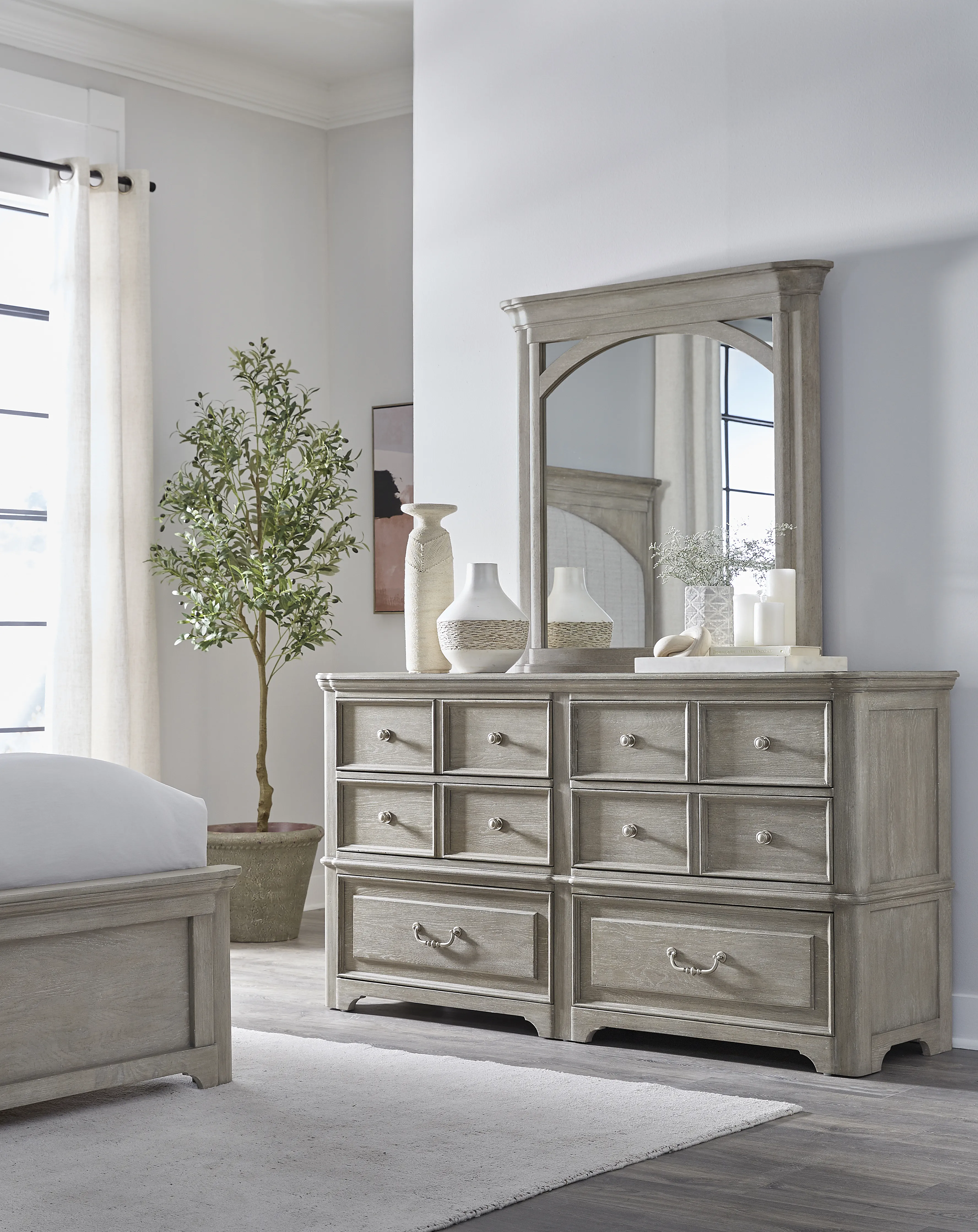 Our elegant Abbotts Glen Dresser Mirror blends sophistication and timeless design. Flanked by classic pilasters, it features soft corners that lend a refined and approachable aesthetic. Bold perimeter moldings add depth and structure, while a gently curved decorative panel enhances the mirror's graceful silhouette. Ideal for pairing with a dresser, this mirror brings functionality and a touch of understated elegance to any bedroom setting.