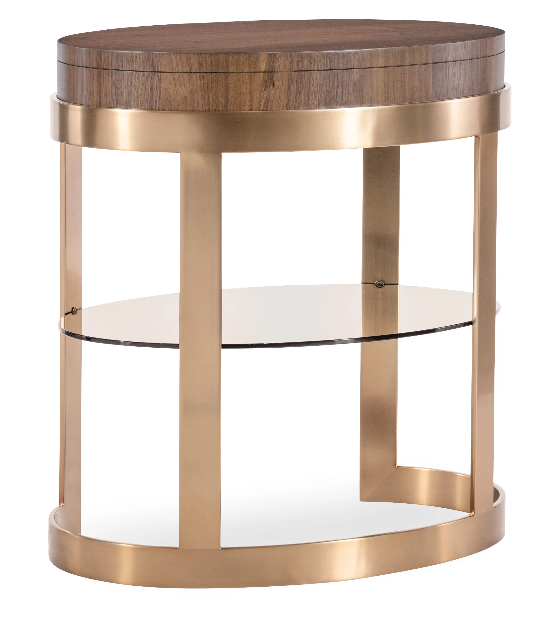 The Eleana Oval Nightstand combines modern sophistication with functionality, featuring a Light Caramel walnut veneer finish, a plated Sunlit Bronze metal base, and a floating solar-bronze glass shelf. Designed with a self-closing drawer, this nightstand adds a touch of elegance and convenience, making it an ideal accent piece for transitional bedrooms.