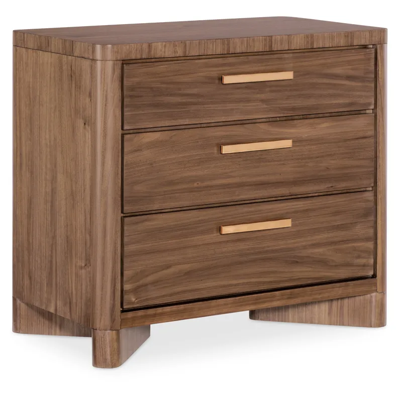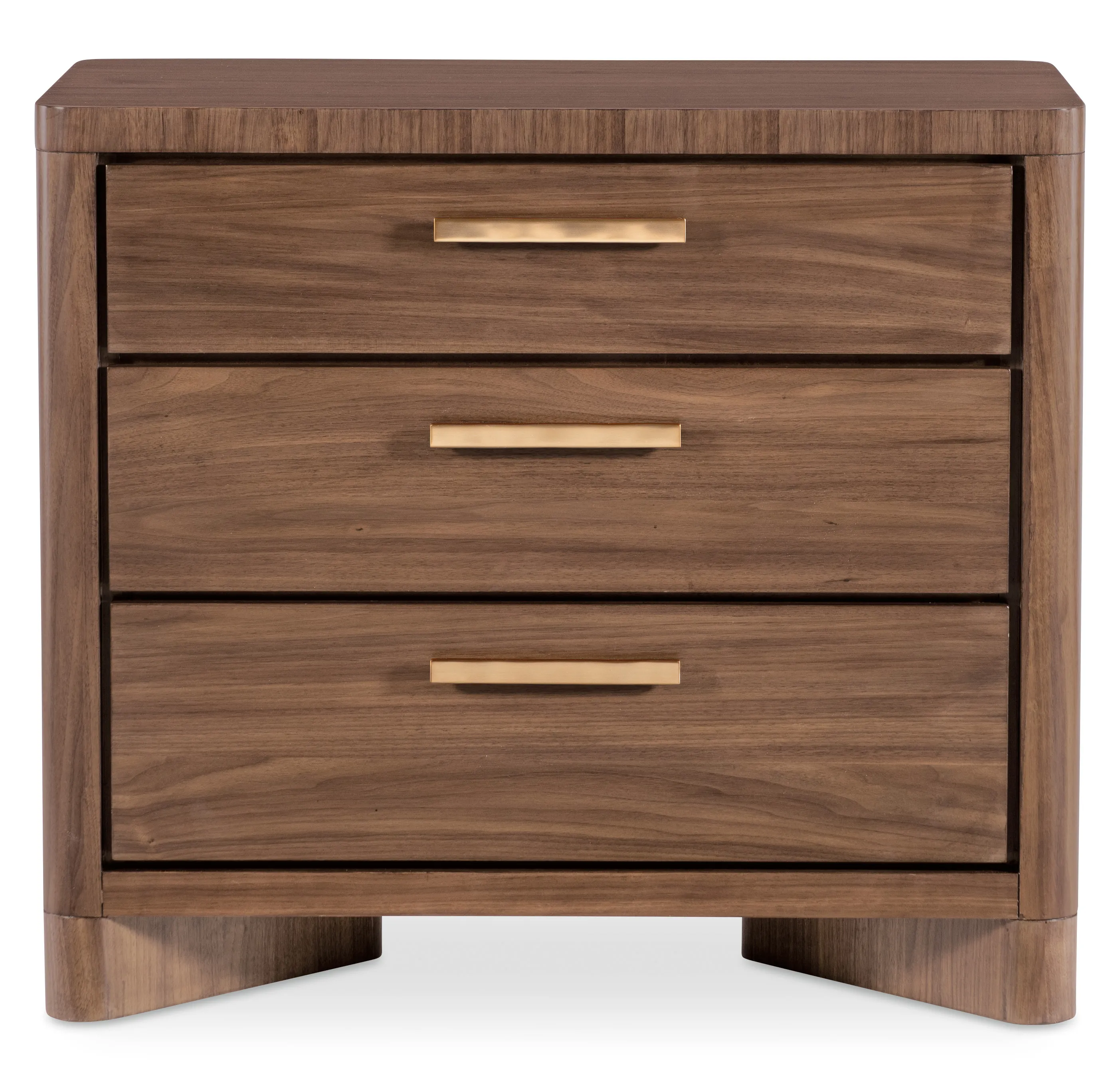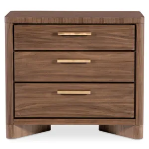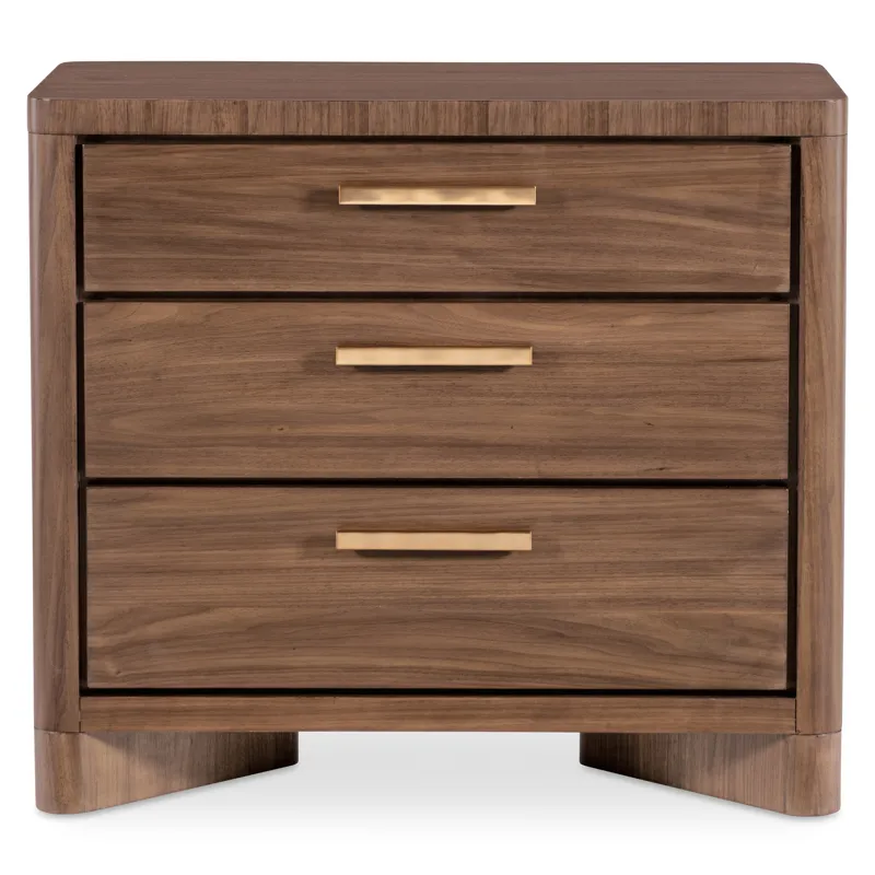 Designed for convenience and style, the Eleana Three Drawer Nightstand features Light Caramel walnut veneers, plated bronze hardware, and rounded corners. Its integrated charging station with dual outlets, along with three self-closing drawers, makes it both functional and luxurious for bedside storage.