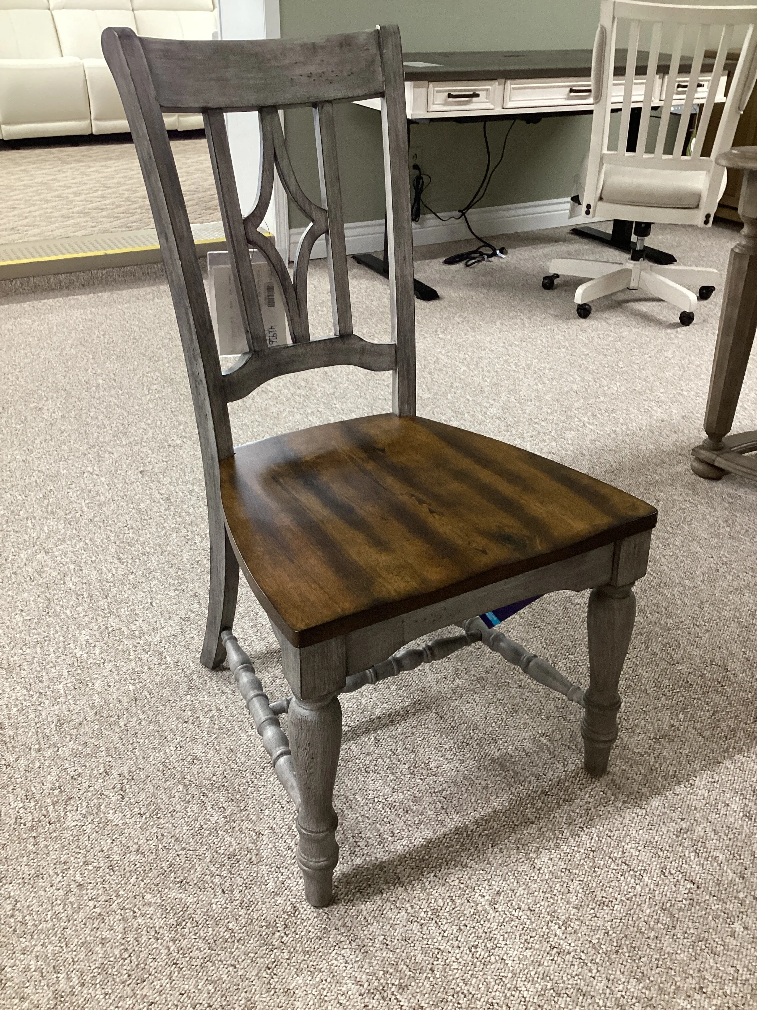 Add cozy charm to mealtimes with the Plymouth dining chair, designed to complement our Plymouth dining tables with a coordinating cottage look. Featuring an appealing open back design with a diamond-shaped detail, intricately carved trestles and turned legs, this chair provides a vintage look that’s full of character. With its weathered graywash finish and contrasting medium brown seat, this chair can be easily mixed and matched with other Plymouth chairs in the collection for a cohesive look.