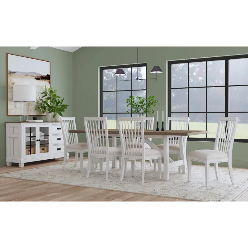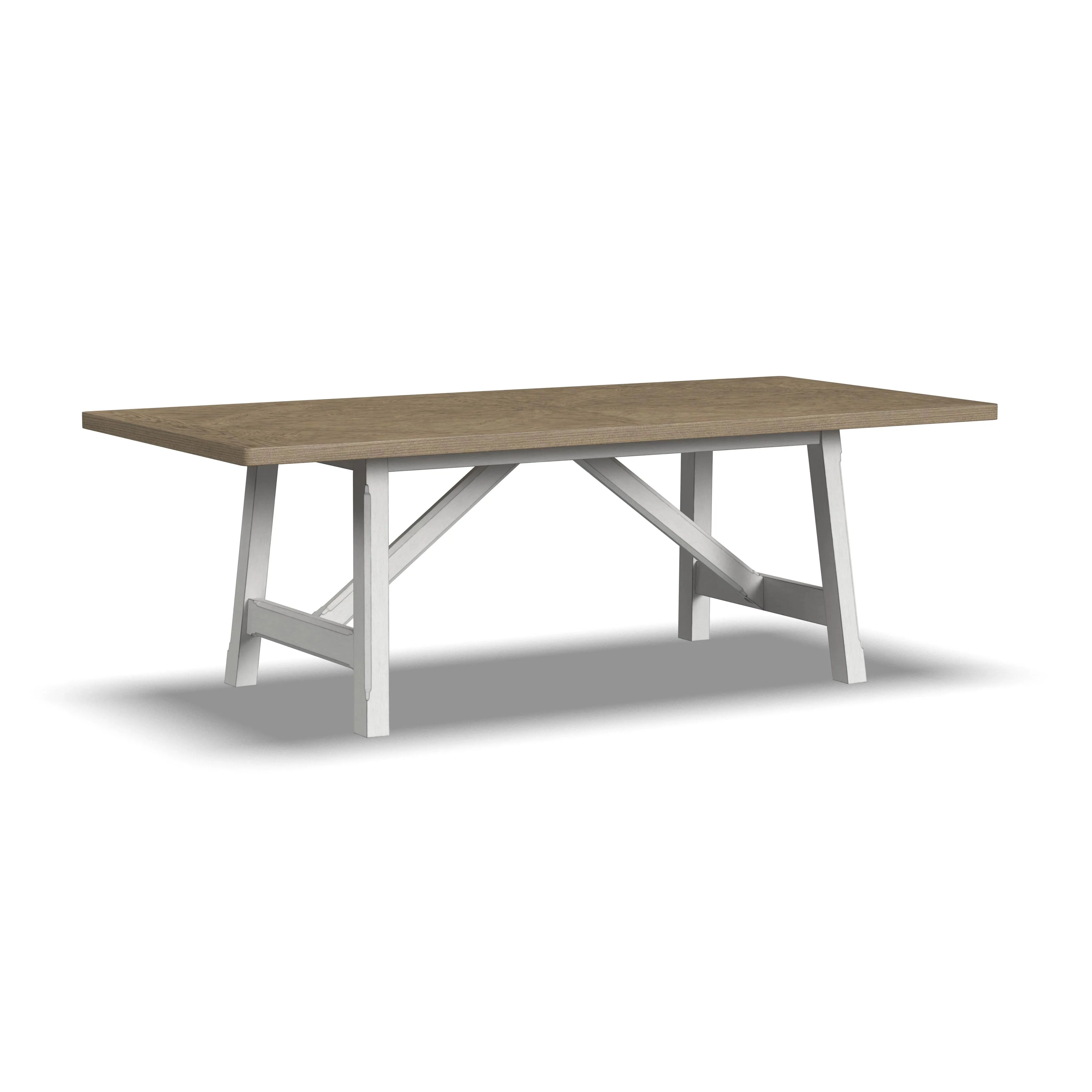 Melody Rectangular Dining Table (W1072-831): 90x 42 x 30 - A transitional design that fits with farmhouse and coastal styles, Subtly distressed white finish with a gray parquet stained top, Constructed from rubberwood solids and white oak veneers, Comfortably seats six people, Chamfered leg trestle base, Assembly required and hardware included