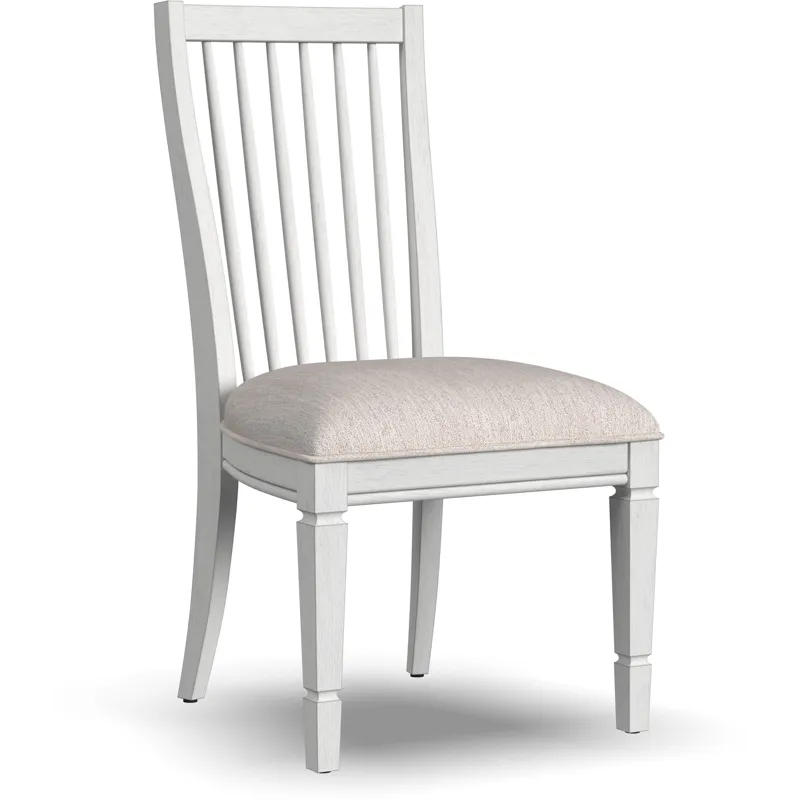Melody Upholstered Dining Chairs x6 (W1072-840): 22 x 23 x 40 - A transitional design that fits with farmhouse and coastal styles, Subtly distressed white finish, Upholstered in an easy to clean performance fabric that is stain-resistant, Constructed from rubberwood solids and white oak veneers, Contemporary Windsor style seat back