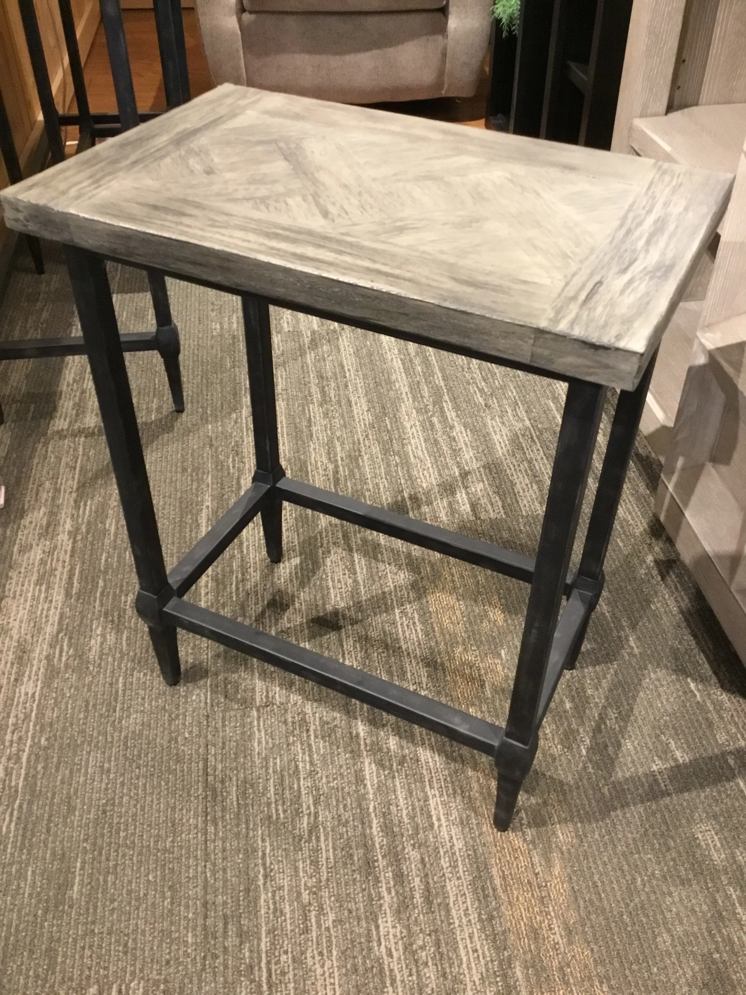 Including a counter height table with two stools, this space-saving design is built to last. Weathered finish blends with any style, with iron base in blackened zinc and marquetry inlay top in a gray glazed driftwood finish. Sizes: Table-48x36x15 Stools(2)-20x25x13
