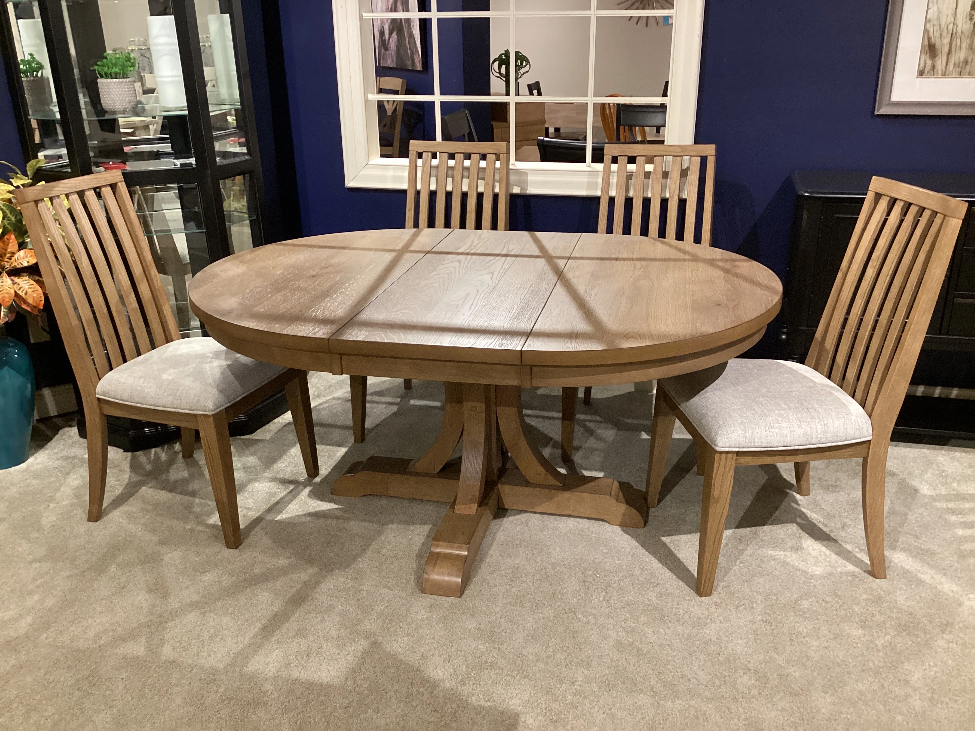 Navada 66" Pedestal table w/18" Leaf (DNA14866): 48W x 48/66D x 30H - Solid Hardwood and Oak Veneer, 18" lift off leaf extends table 48" to 66", Side chair knee hole: 11", Top Thickness: 0.75", Apron: 2.5", Floor to apron: 26", Pedestal: 40" diameter (barrel: 3.75"W x 3.75"D x 21.5"H, feet: 21.75"W x 2.5"D x 2.5"H)