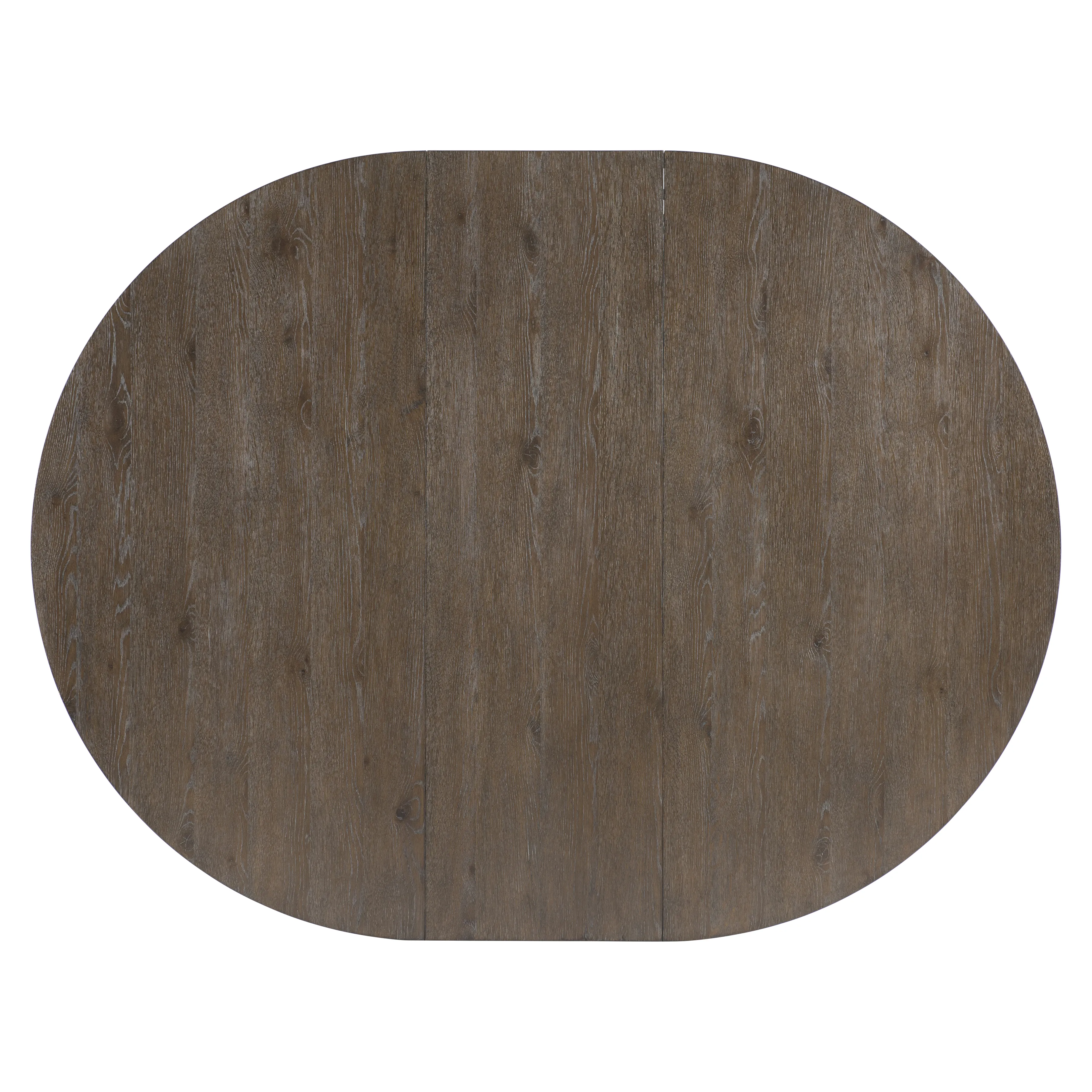 Top: Wirebrushed Oak dining table top in Cassel finish. One 18" leaf. BASE: Wirebrushed Oak Pedestal Dining Table base in Cassel finish. Adjustable glides.