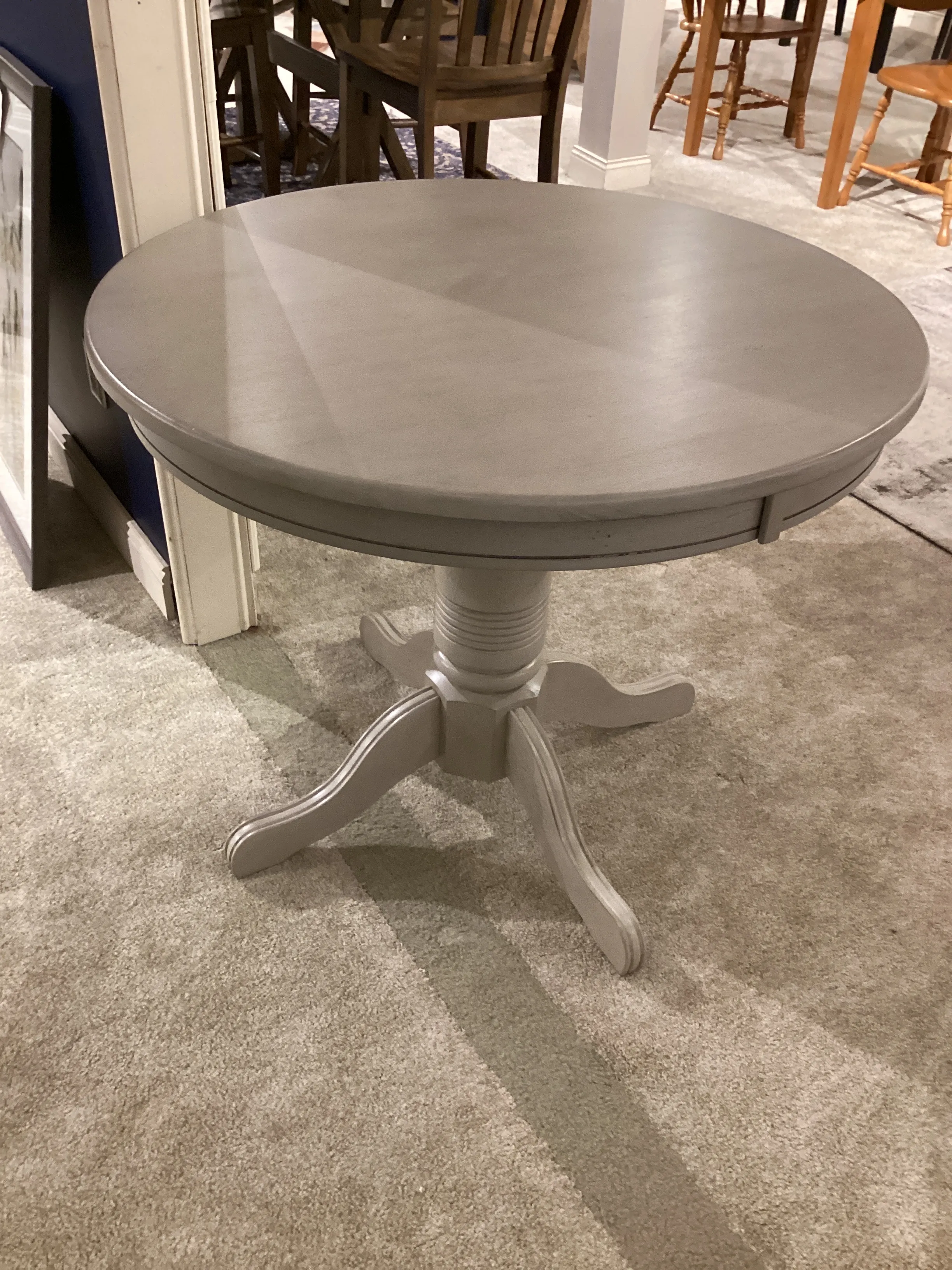 Solid hardwood and clean functional design. Muted oyster grey offers a strong, simple dining room foundation suited for small to large areas with standard or counter height options.