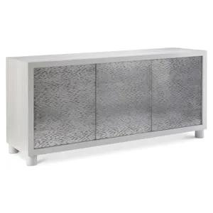 The inspiration for the Brindisi buffet is clear to see as it showcases a Cubist style. Interconnected dimensional designs are cast in resin on each door front in a Crema faux stone finish. The frame is in the Sandbar finish on veneered white oak. Suitable for dining storage or for media components, the doors open to reveal adjustable and fixed shelving, as well as a soft-close drawer with a hand-pull cutout.