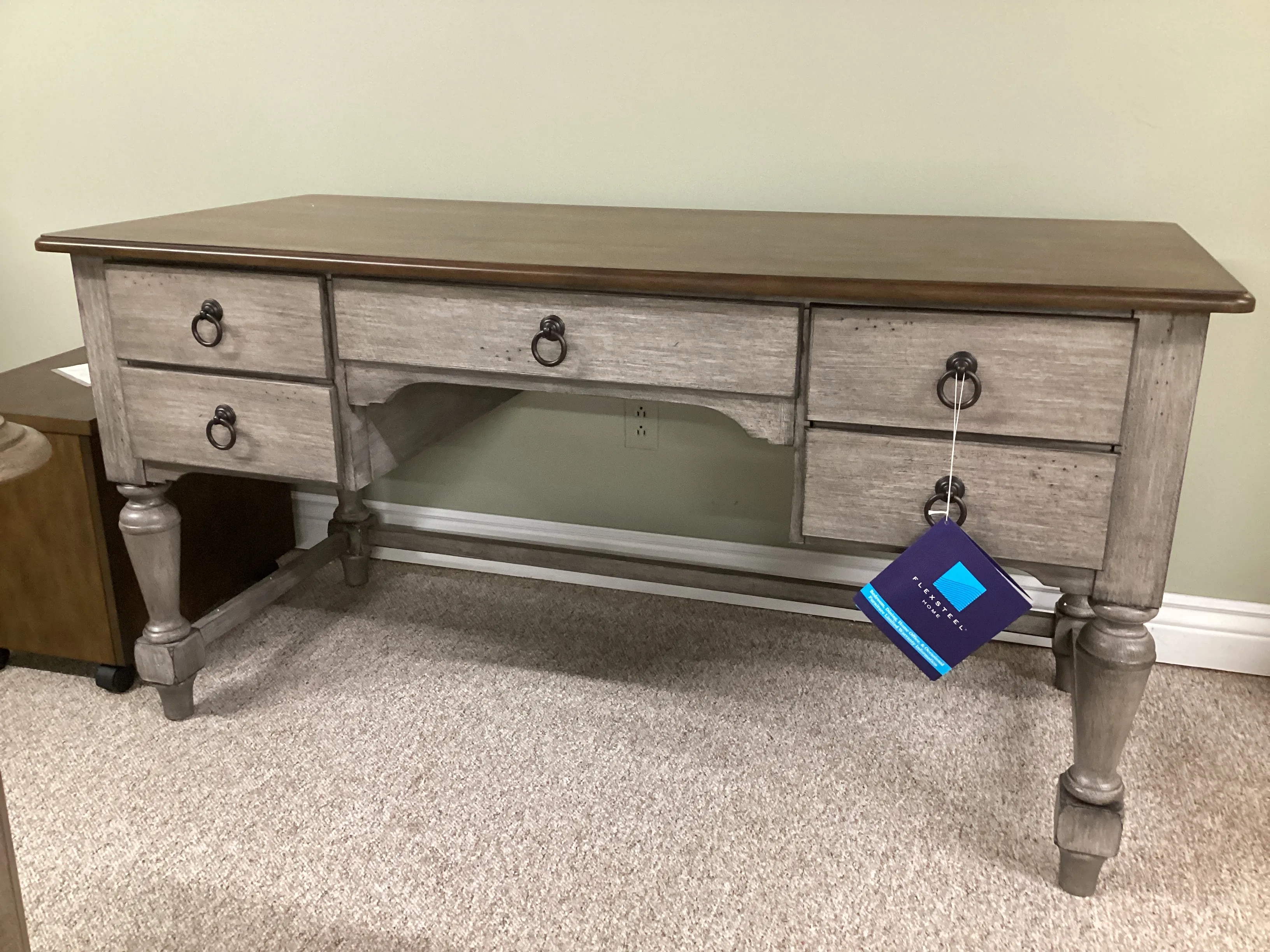 Transform your home office into a charming cottage retreat and still stay productive with the Plymouth writing desk. Loaded with practical features, this desk offers a spacious top for spreading out documents, a convenient pull-out, drop-down surface on the center drawer that can be used as a keyboard tray and removable pencil tray to neatly store office supplies. Two drawers on ball-bearing glides provide a place to store hanging files and other office essentials, while adjustable and removable drawer dividers further enhance organization. A weathered graywash finish is enhanced by the medium brown table top, while spool-turned legs and gunmetal pulls add vintage warmth and character.