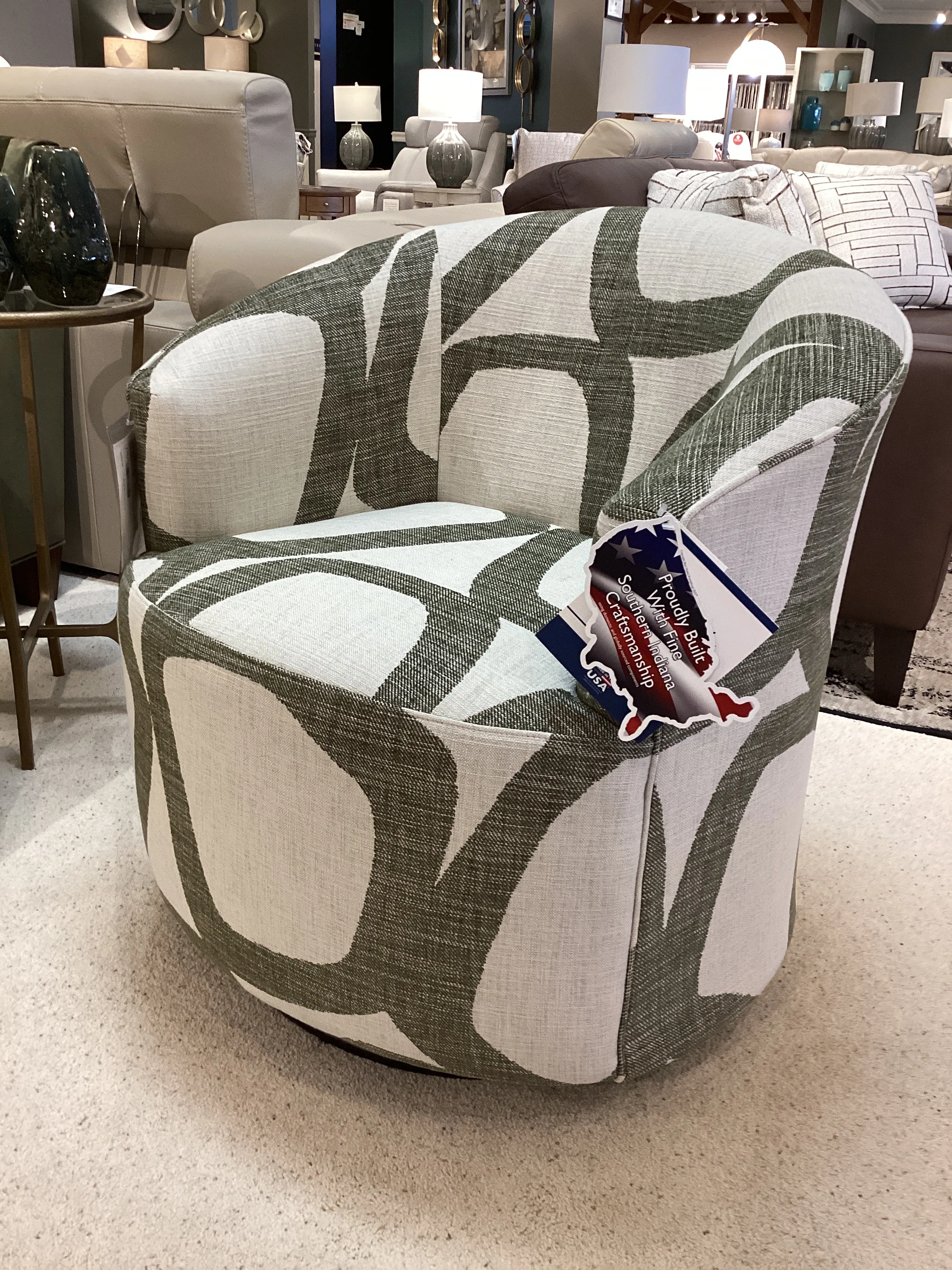 Simplicity describes this Kahlari swivel glider chair. The tall back curves around and flows seamlessly to the handcrafted cording and accents. The smooth, tight seat with extra tall deck sits atop the low profile swivel base. The whisper smooth glide action combined with the 360-degree swivel action provides a versatile and functional accent piece. Over 700 fabrics are available to make it your own. Expertly crafted in the USA.