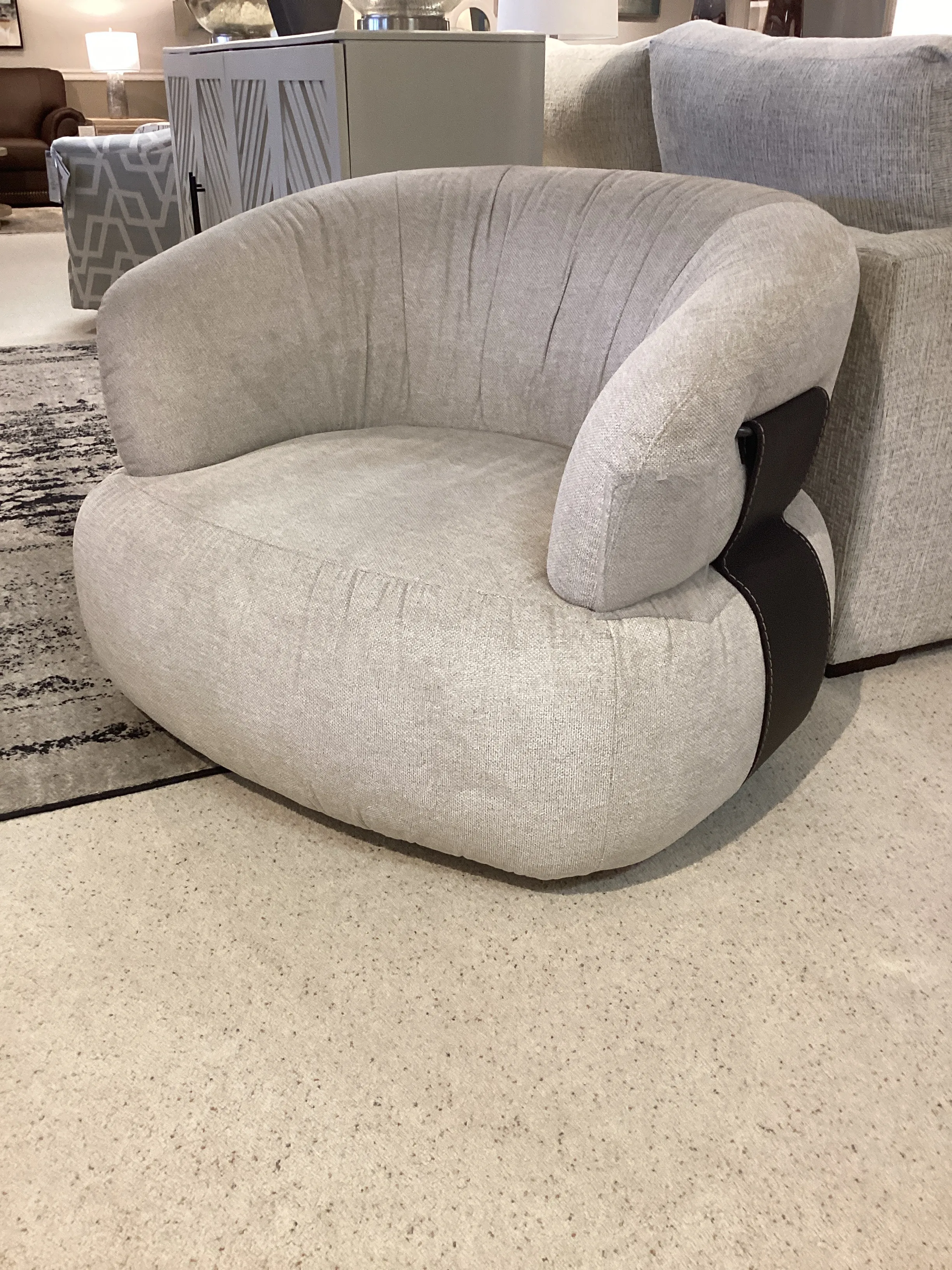 Sturdy and generously round, the design is embellished by details such as the refined leather bands sewn onto both sides, linking the seat to the backrest.